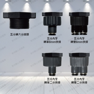 四分軟管,例如:四分耐壓管(型號:A04)、四分PE管(型號:I1)轉接二分小黑管(型號:A02)或8mm黑管