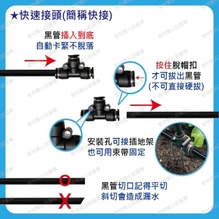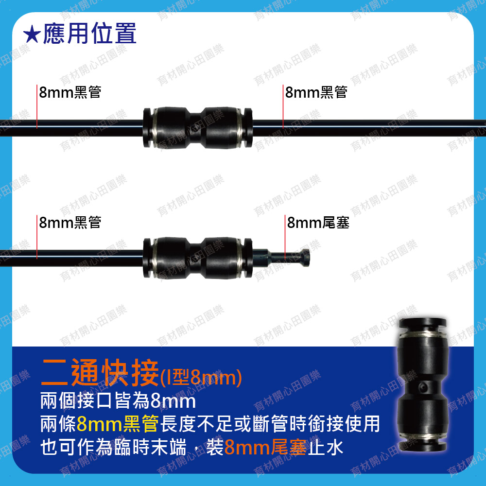8mm快速接頭-多款適用管徑8mm黑管:如育材陽台庭院...等澆水系統8mm黑管直接剪斷即可安裝、拆裝方便。