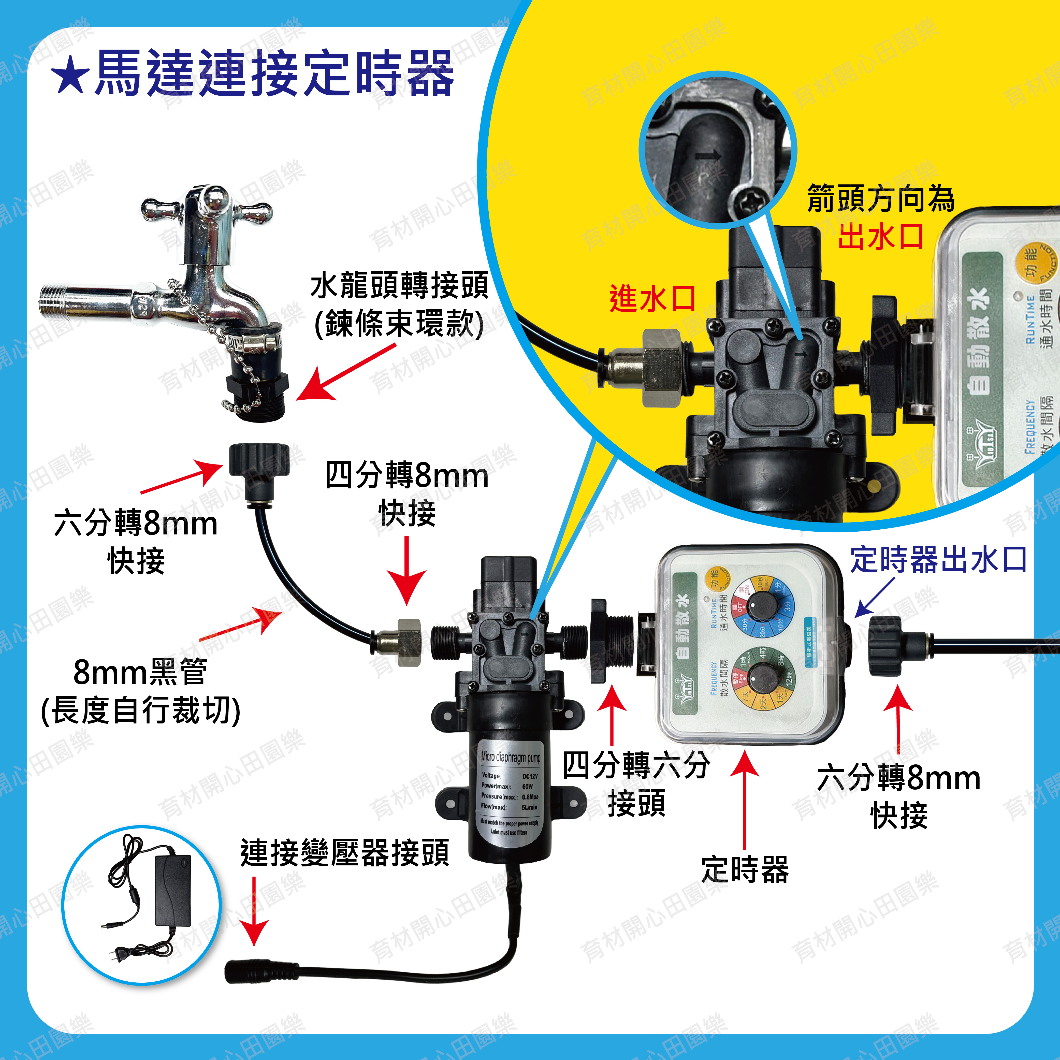 1.限用於育材電磁閥定時器,定時器本身耐高水壓,馬達出水口直接裝電磁閥定時器。