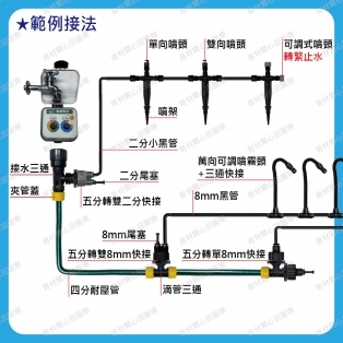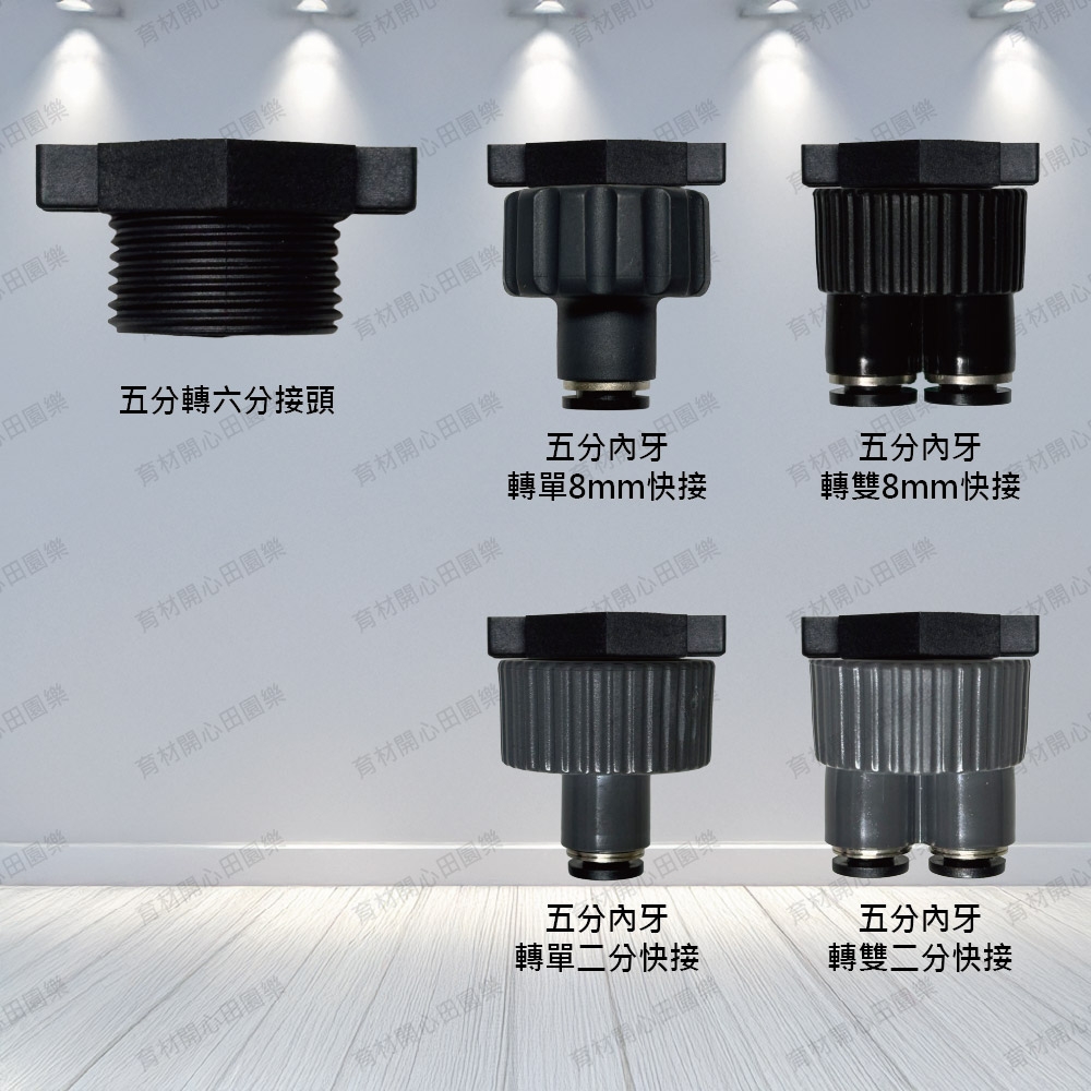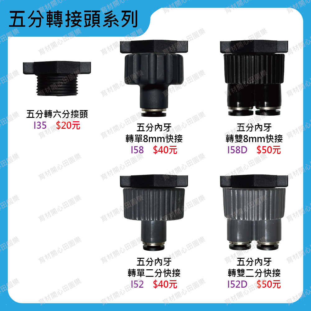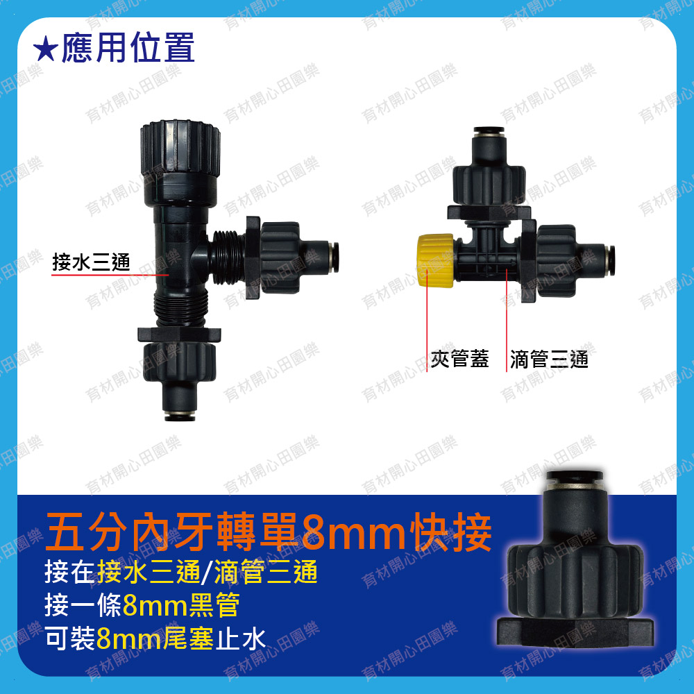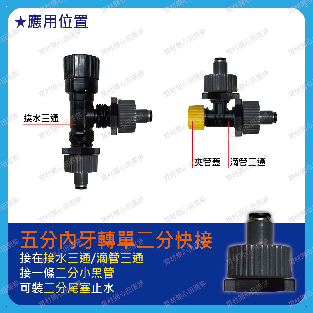 五分內牙轉六分外牙接頭接在接水三通/滴管三通外牙接頭依需求接對應的轉接頭可快接8mm黑管或二分小黑管