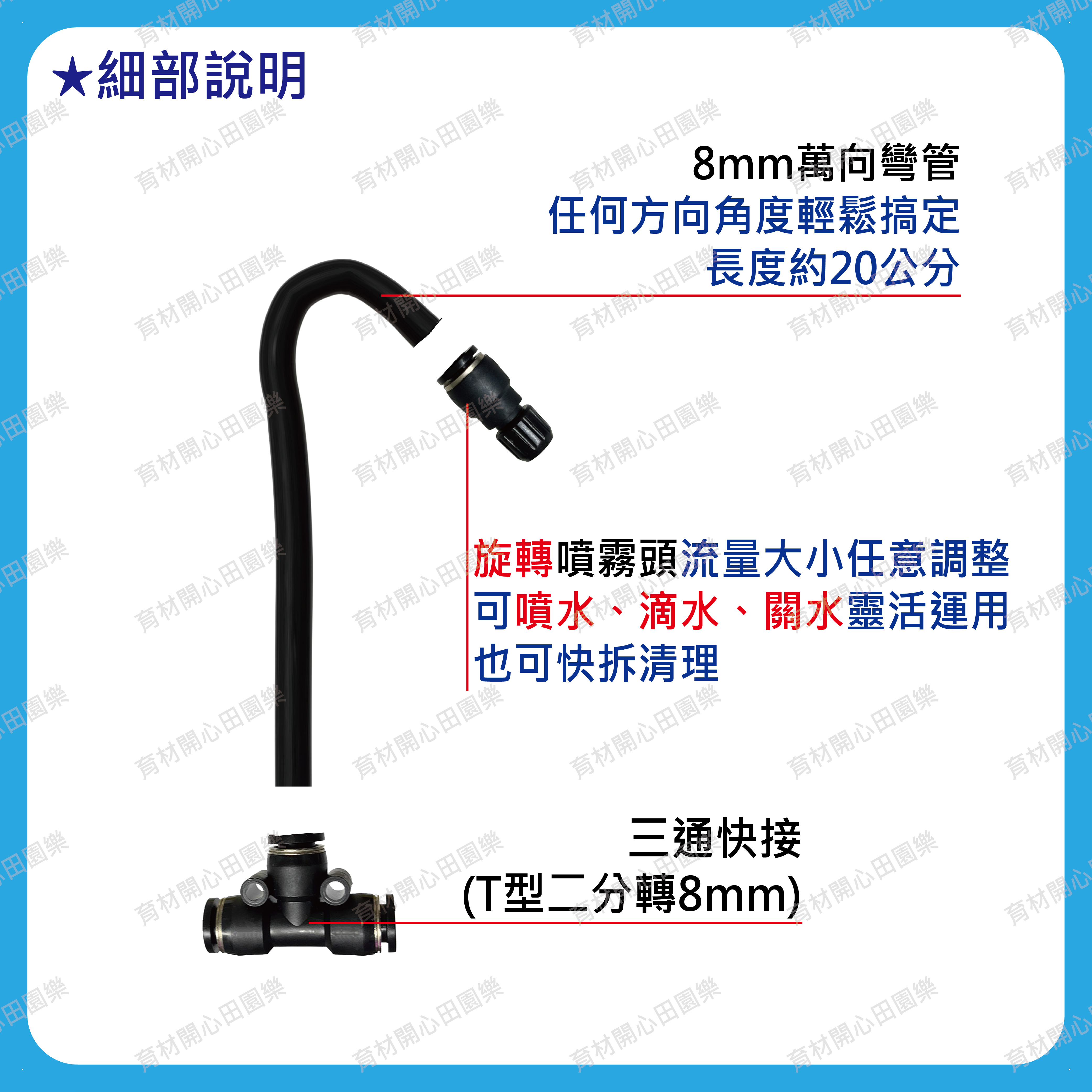 1.噴頭萬向可調快插安裝輕鬆簡單、任意彎曲方向、噴頭可任意彎曲方便精準定位澆水位置,每個噴頭流量大小可任意調整。