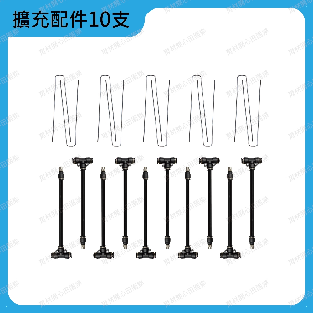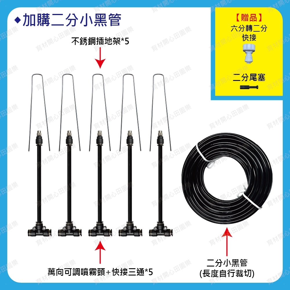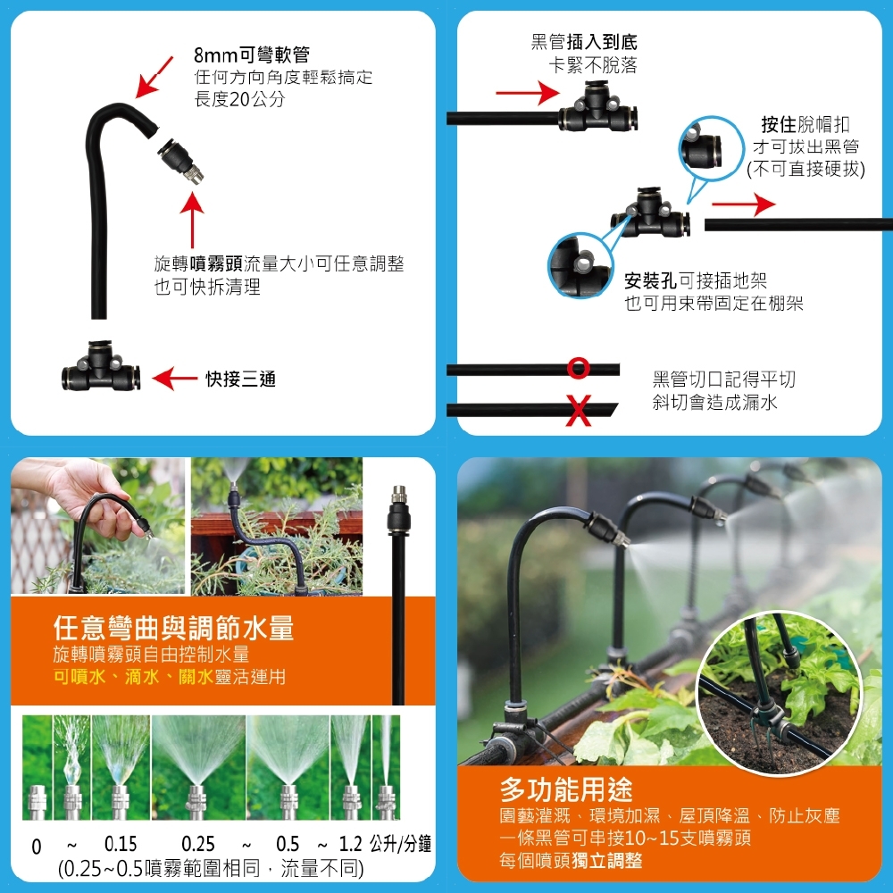 3.二分小黑管可跟陽台庭院套組共用,一條小黑管建議串接5~10支噴霧頭,使用快接三通串接安裝方便。管線末端插入二分尾塞即可止水。