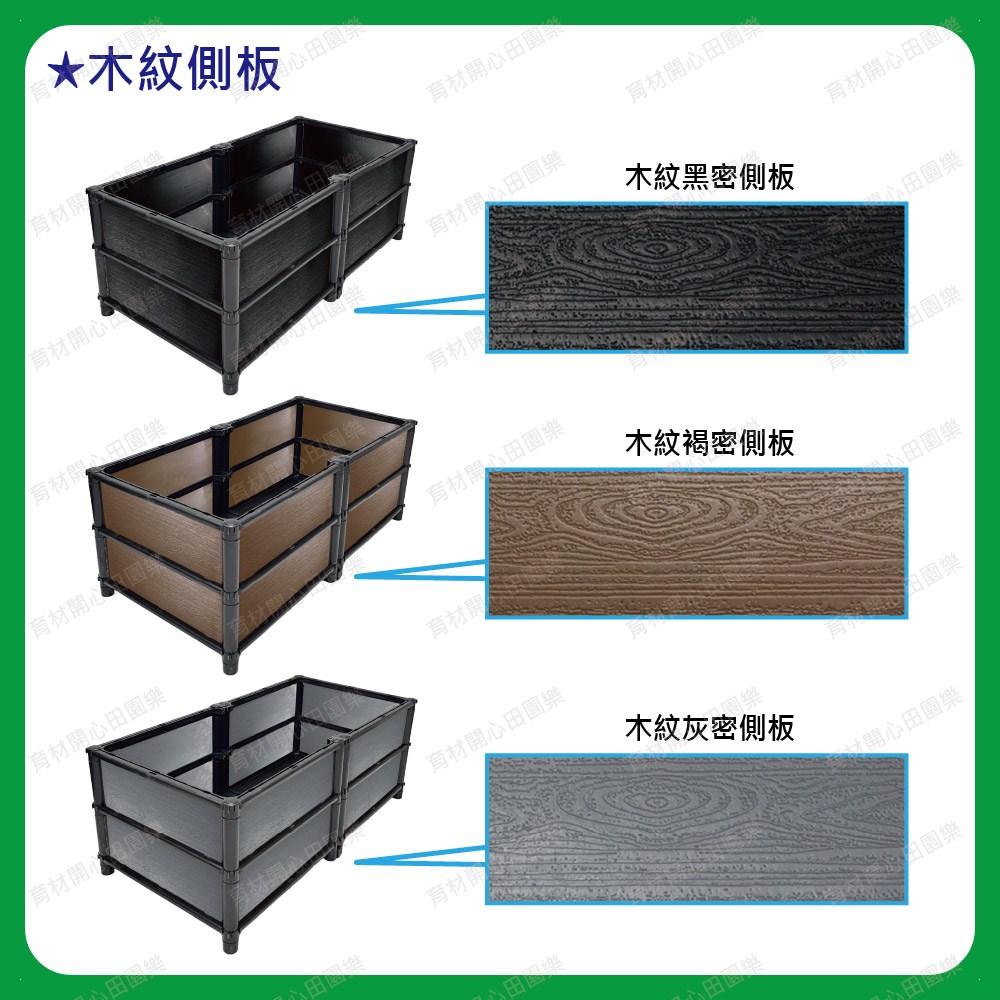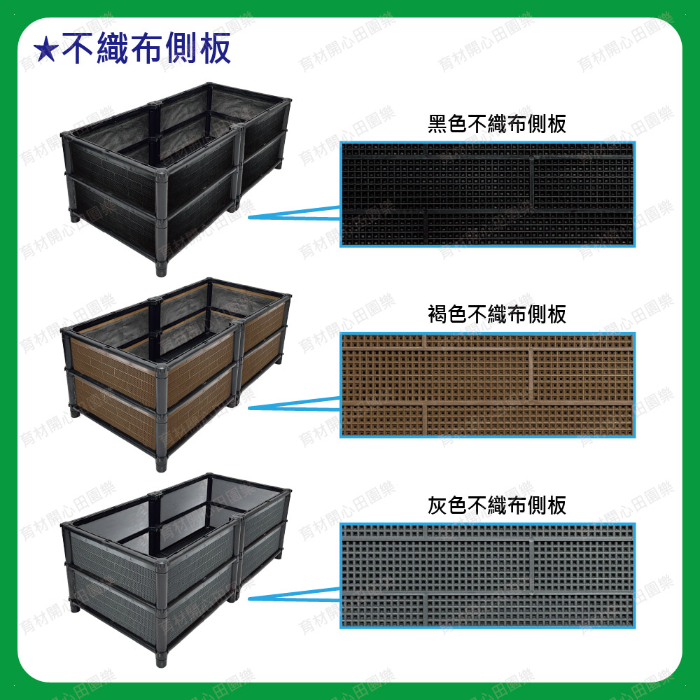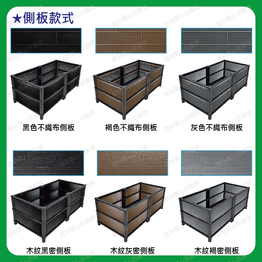 雙層尺寸種植箱,箱子裝土量較深,適合種植深根植物及花卉等。側板分為不織布側板、網孔側板、密側板,依需求可選擇不同種類側板*不織布側板: 防止土壤流失並兼顧排水性*網孔側板: 網孔通風性可加速土壤乾燥*密側板: 外觀不卡汙泥且保水性極佳網孔側板: 網孔通風性可加速土壤乾燥密側板: 外觀不卡汙泥且保水性極佳