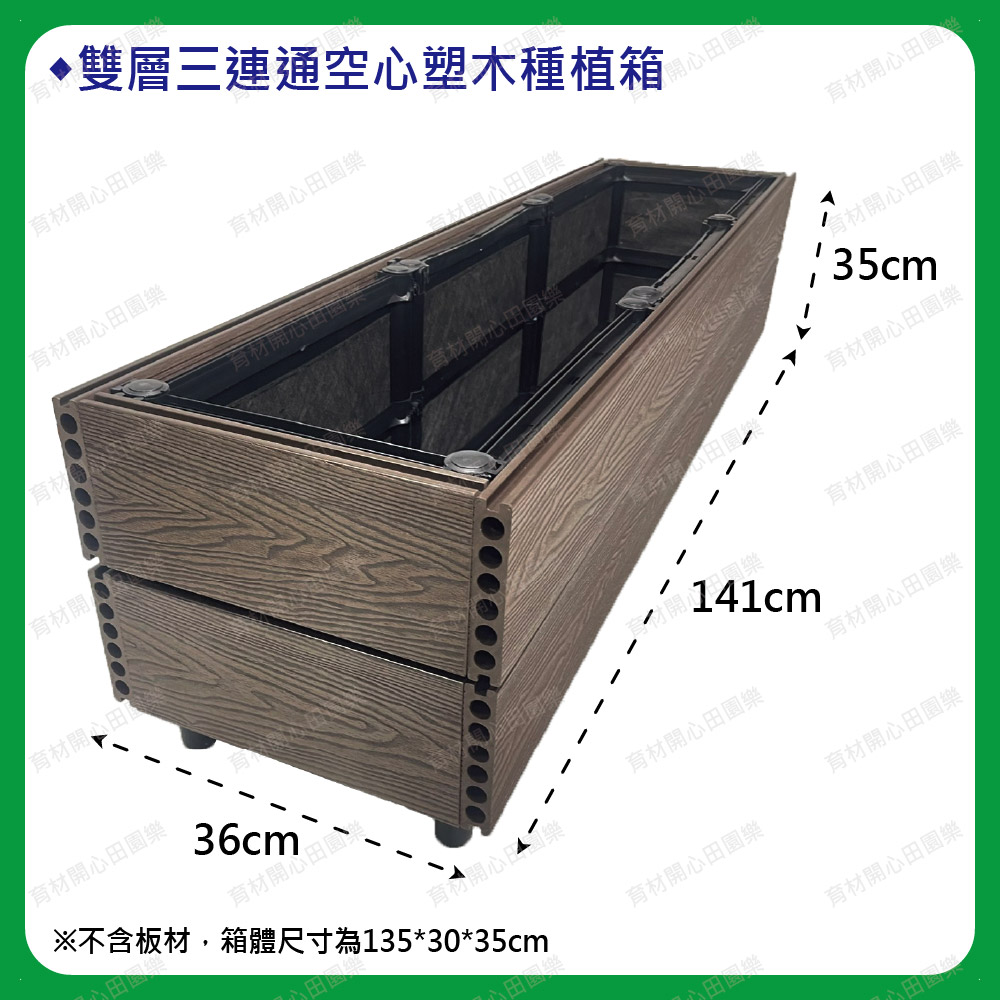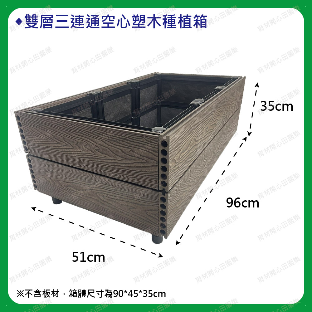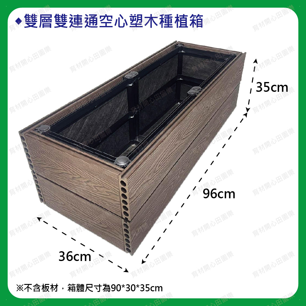 塑木扣片扣入原本的種植箱,空心塑木板厚度2.5cm:1呎120元雙層箱組裝後總高皆為35cm(1尺=30公分)