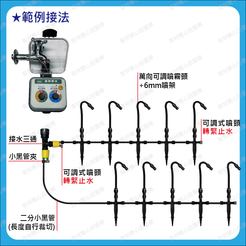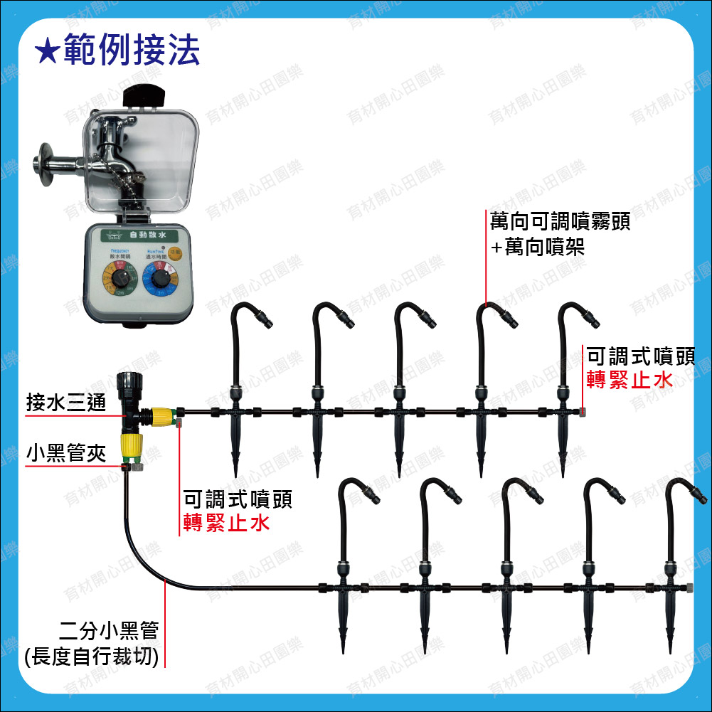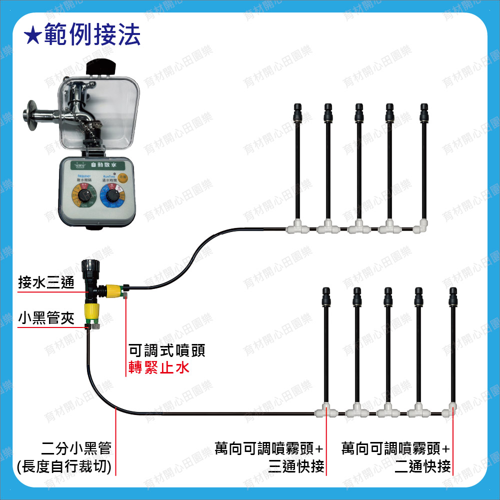 *建議一道小黑管串接5支即可。再多可能因水壓噴霧效果不佳,可另外參考小型加壓馬達。