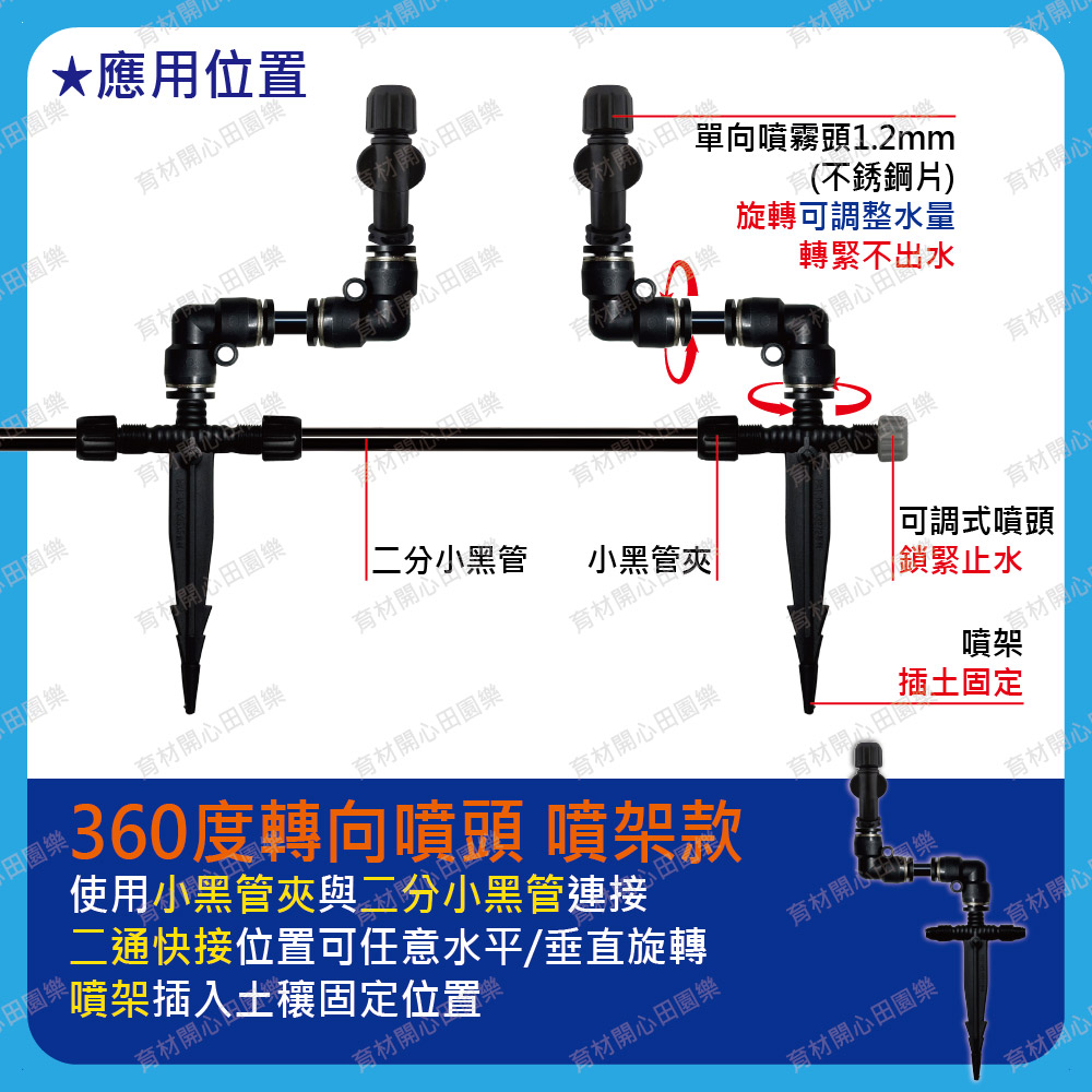 用噴架串接,可直接插入盆栽使用小黑管夾+可調式噴頭(末端止水用)