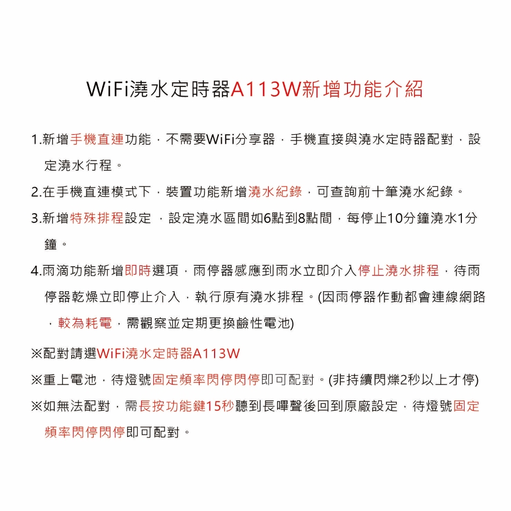 A113W WiFi定時器 : 網路環境適用,可多台手機共同登入APP管理定時器,可設定六個澆水行程、可設定連線後立即澆水一次、標配雨天停水器。