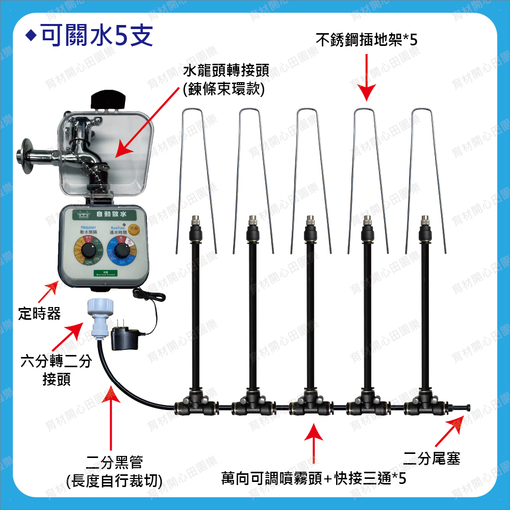3.二分小黑管可跟陽台庭院套組共用,一條小黑管建議串接5~10支噴霧頭,使用快接三通串接安裝方便。管線末端插入二分尾塞即可止水。