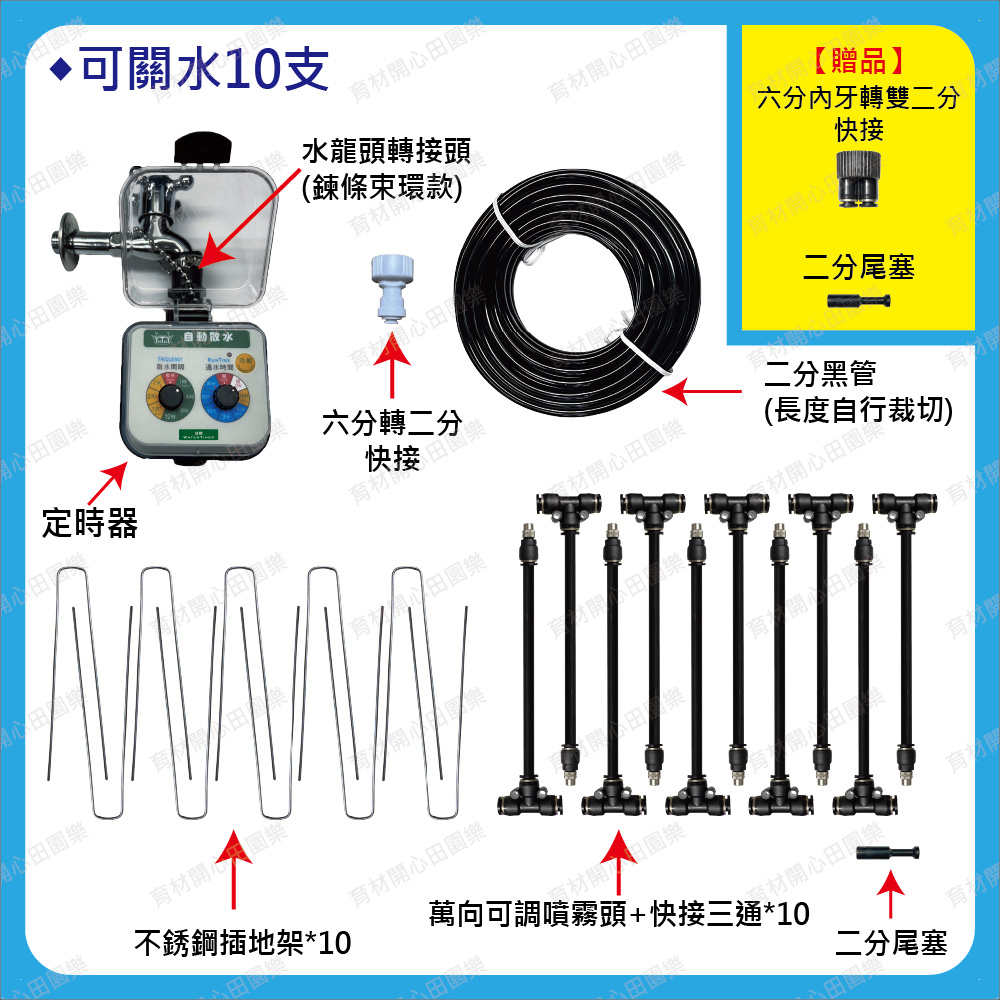 3.二分小黑管可跟陽台庭院套組共用,一條小黑管建議串接5~10支噴霧頭,使用快接三通串接安裝方便。管線末端插入二分尾塞即可止水。