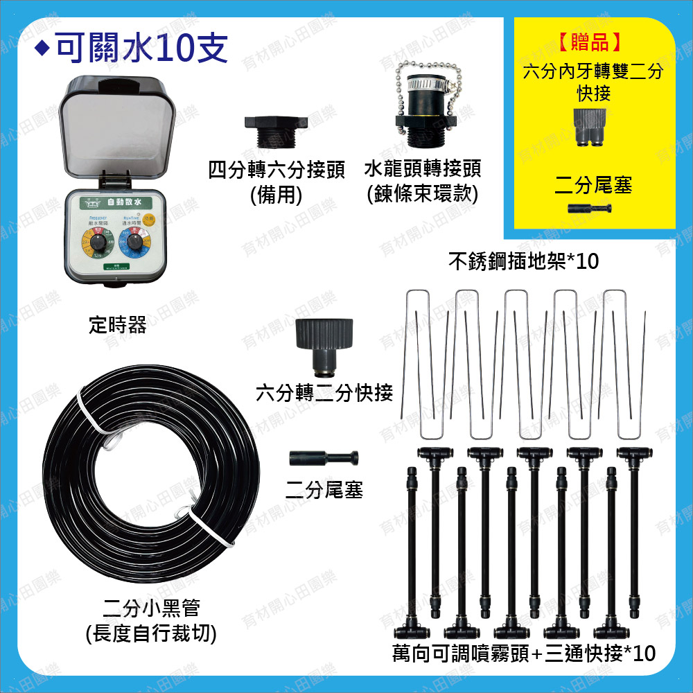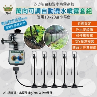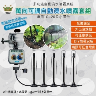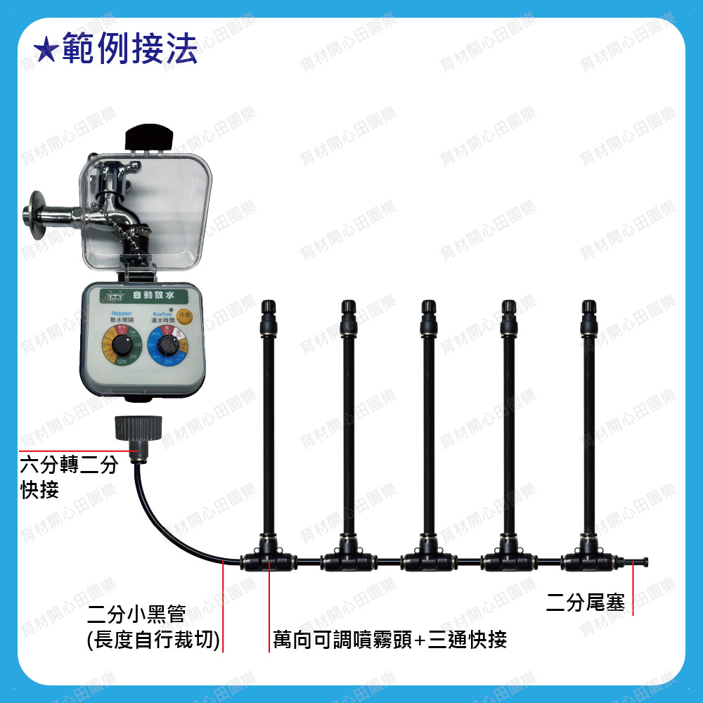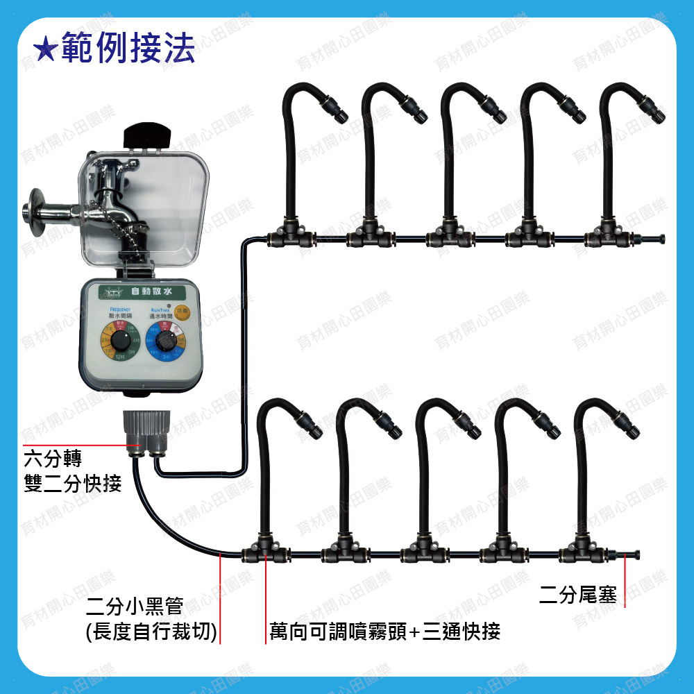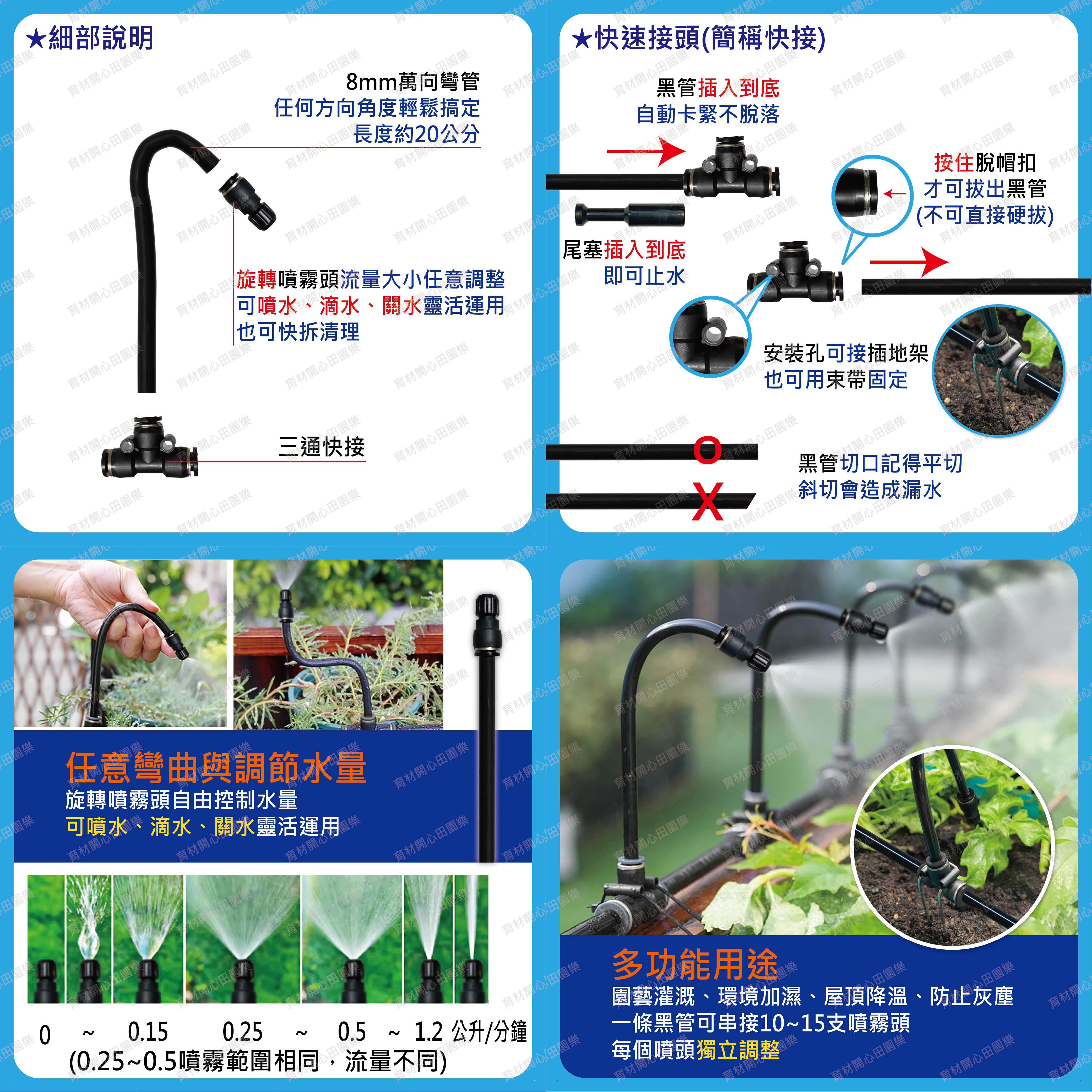 3.二分小黑管可跟陽台庭院套組共用,一條小黑管建議串接5~10支噴霧頭,使用快接三通串接安裝方便。管線末端插入二分尾塞即可止水。