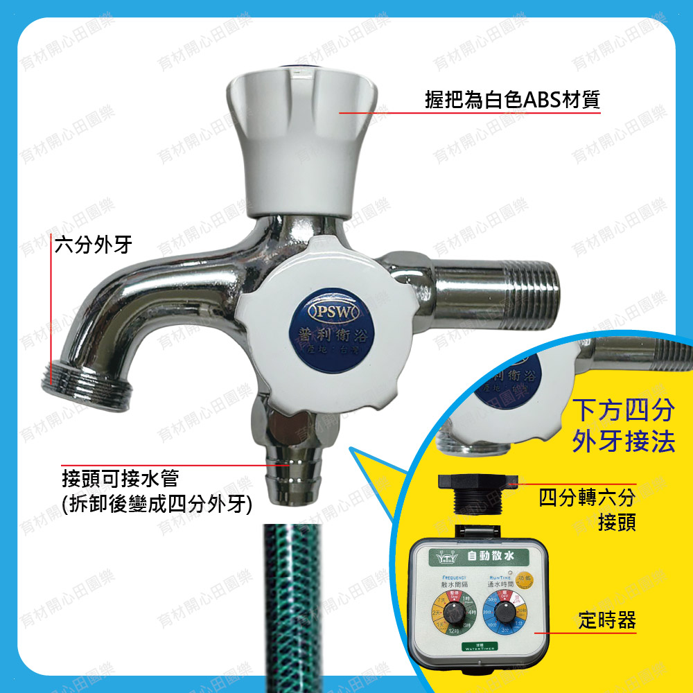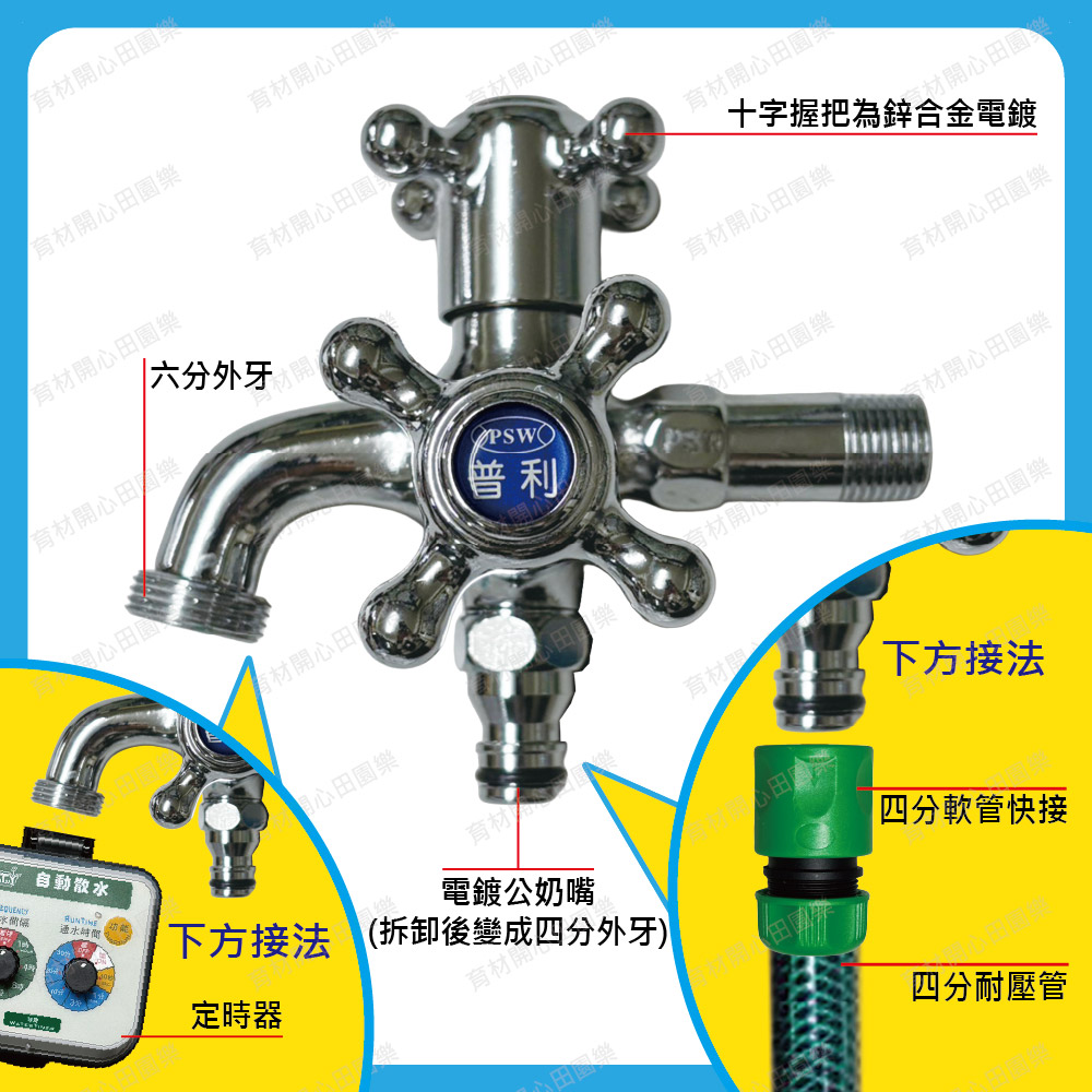 更換本公司專用六分外牙龍頭,也可不經由自動澆水定時器直接裝上接水三通、接水二通,可自行手動開關水,配合串接小黑管、噴頭,達到逐盆逐量澆水或是噴霧。