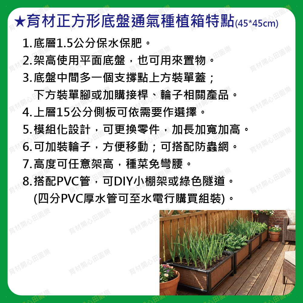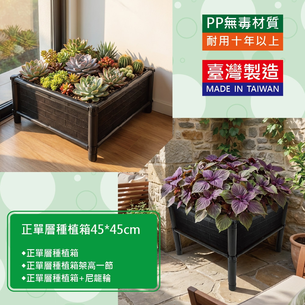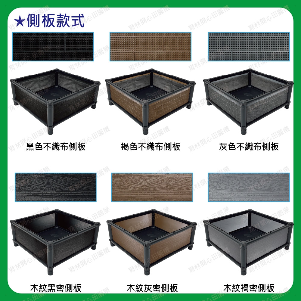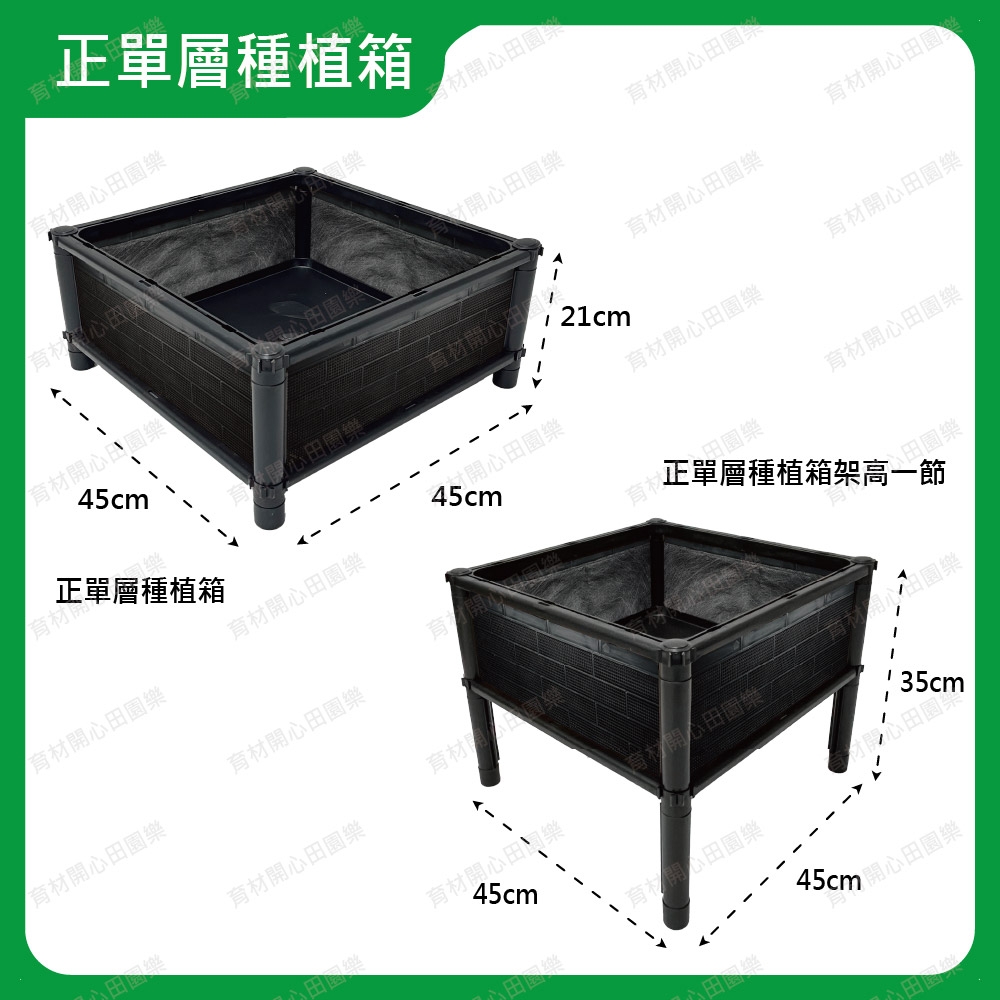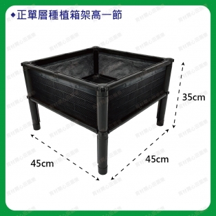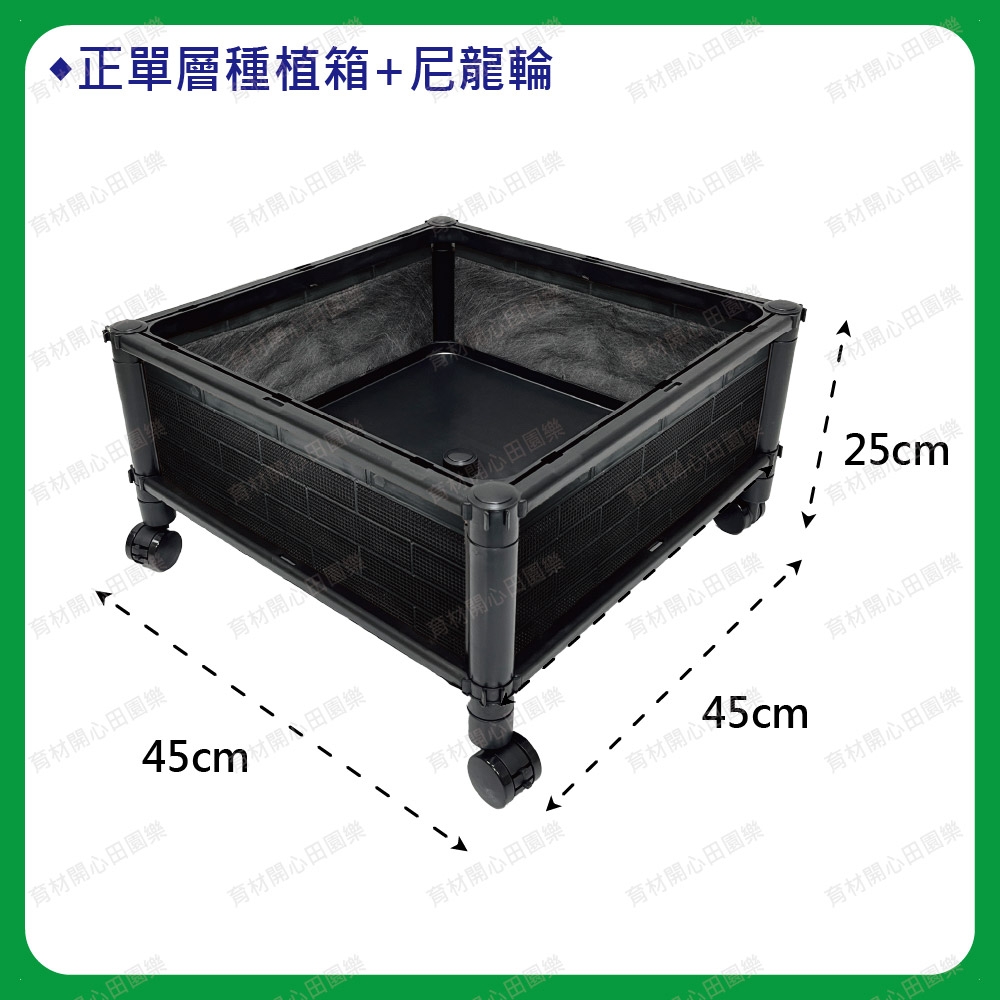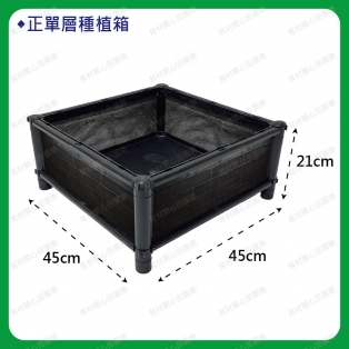 尺寸為45*45公分,正方形設計產品特點:1. 側板分為不織布側板、網孔側板、密側板,依需求可選擇不同種類側板不織布側板: 防止土壤流失並兼顧排水性密側板: 外觀不卡汙泥且保水性極佳2.底部中間多一個支撐點可支撐3.可多個拼接組合