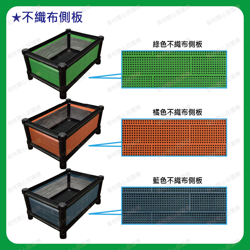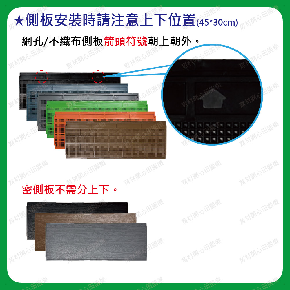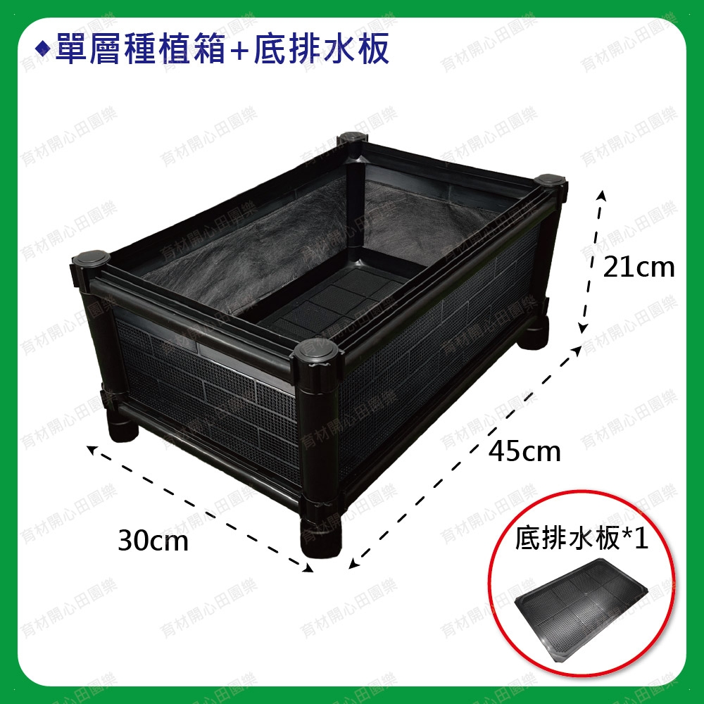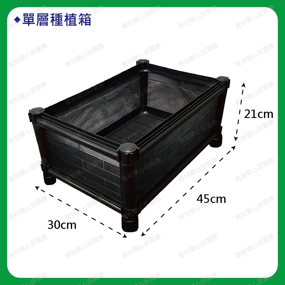 尺寸為45*30公分,最小基本尺寸的種植箱產品特點:1. 側板分為不織布側板、網孔側板、密側板,依需求可選擇不同種類側板 不織布側板: 防止土壤流失並兼顧排水性 網孔側板: 網孔通風性可加速土壤乾燥 密側板: 外觀不卡汙泥且保水性極佳2. 建議加購底排水板, 可達土水分離