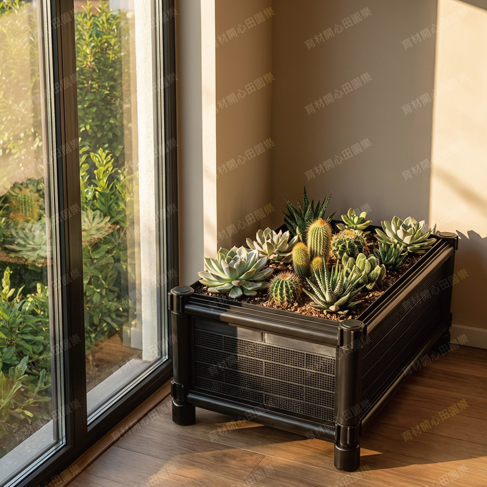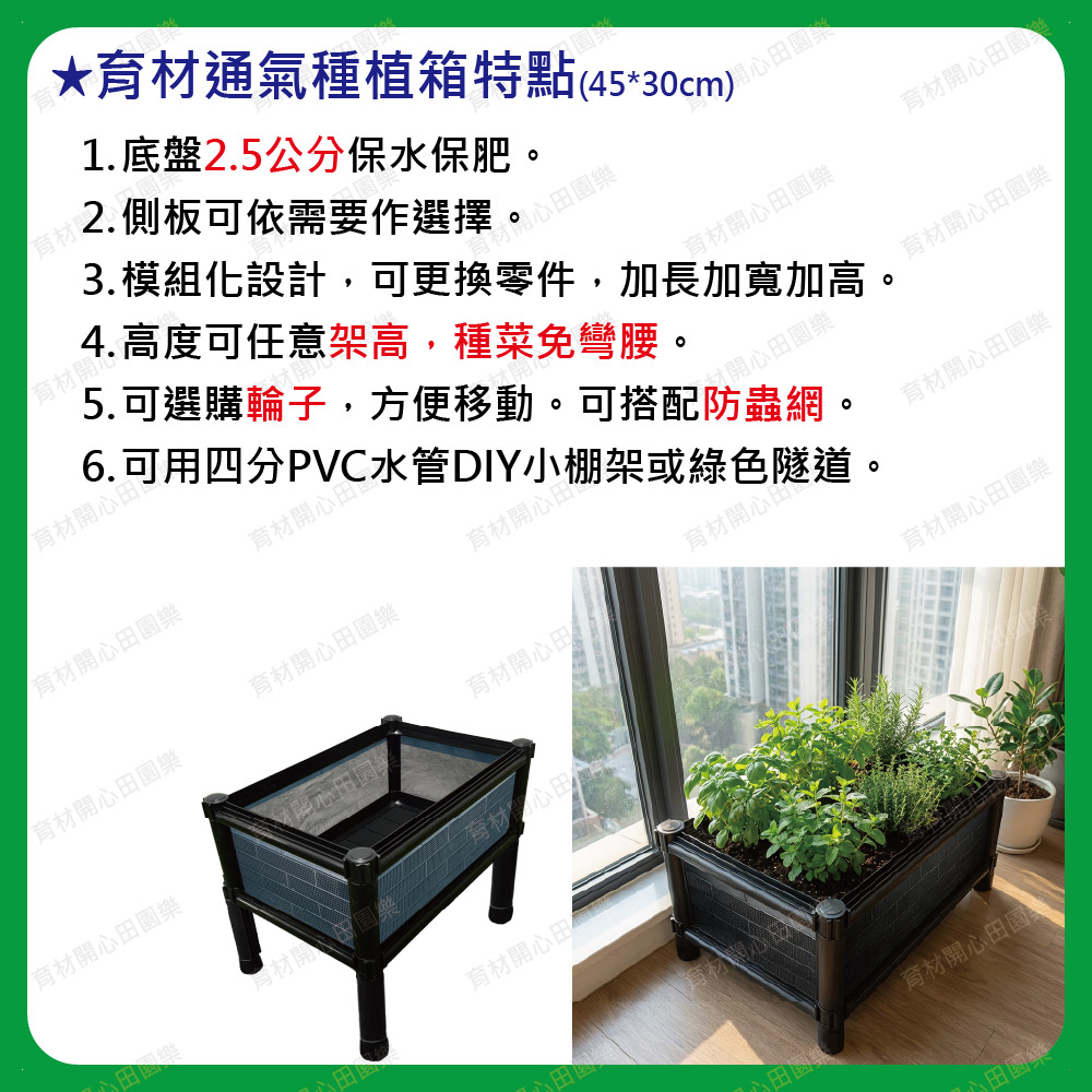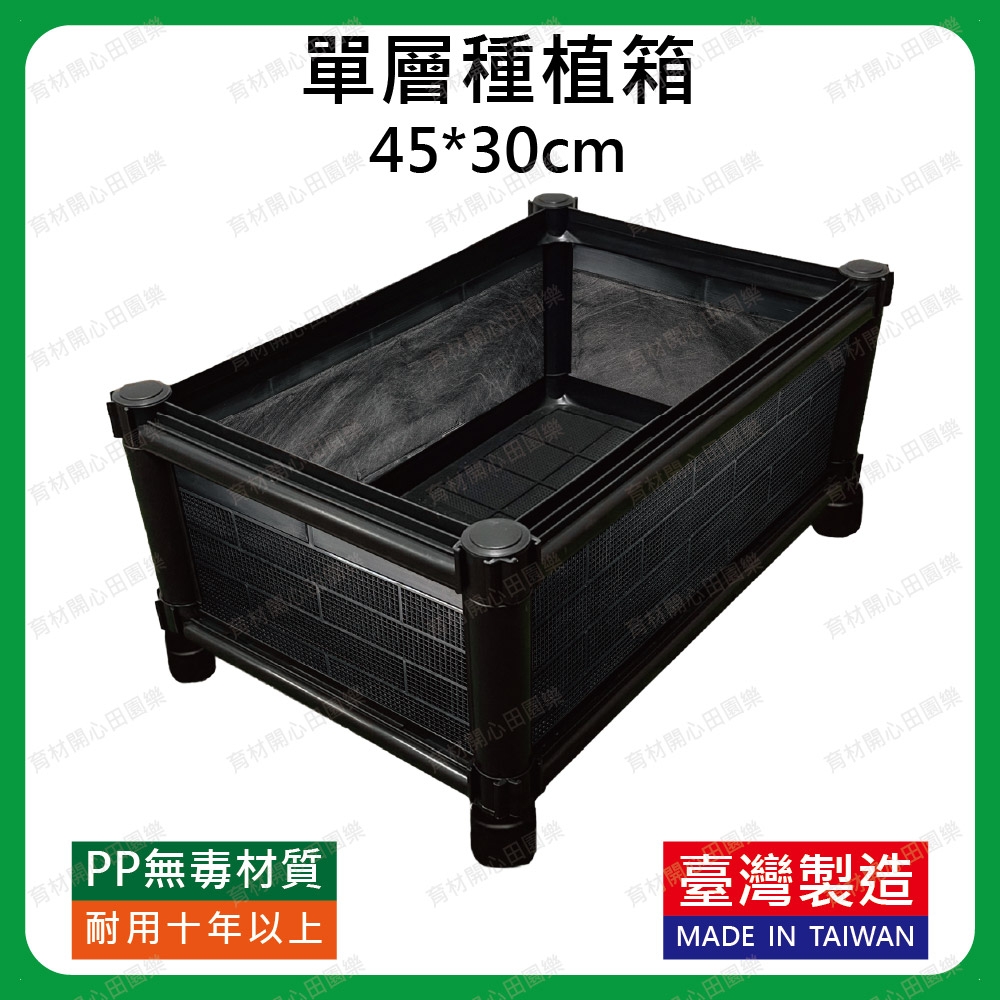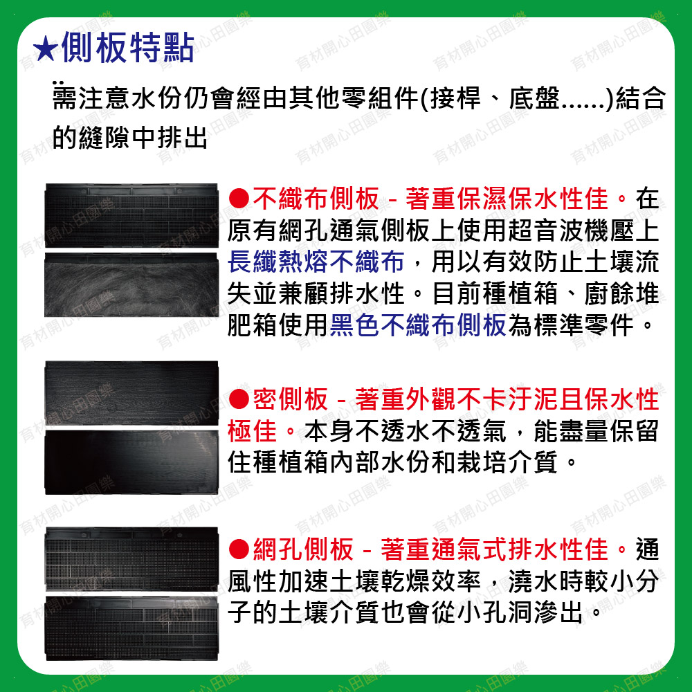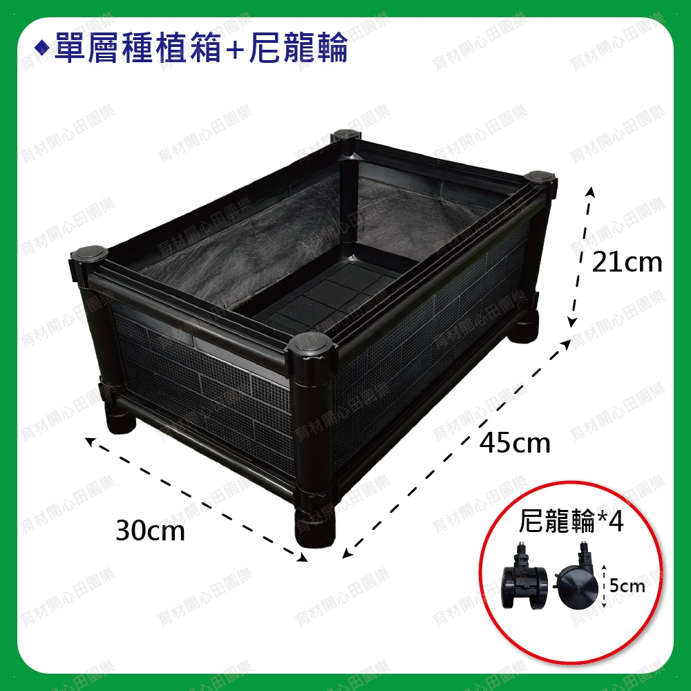 尺寸為45*30公分,最小基本尺寸的種植箱產品特點:1. 側板分為不織布側板、網孔側板、密側板,依需求可選擇不同種類側板 不織布側板: 防止土壤流失並兼顧排水性 網孔側板: 網孔通風性可加速土壤乾燥 密側板: 外觀不卡汙泥且保水性極佳2. 建議加購底排水板, 可達土水分離