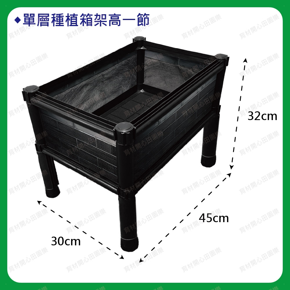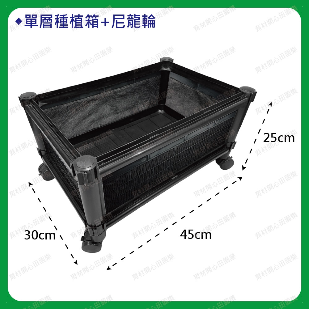 尺寸為45*30公分,最小基本尺寸的種植箱產品特點:1. 側板分為不織布側板、網孔側板、密側板,依需求可選擇不同種類側板 不織布側板: 防止土壤流失並兼顧排水性 網孔側板: 網孔通風性可加速土壤乾燥 密側板: 外觀不卡汙泥且保水性極佳2. 建議加購底排水板, 可達土水分離