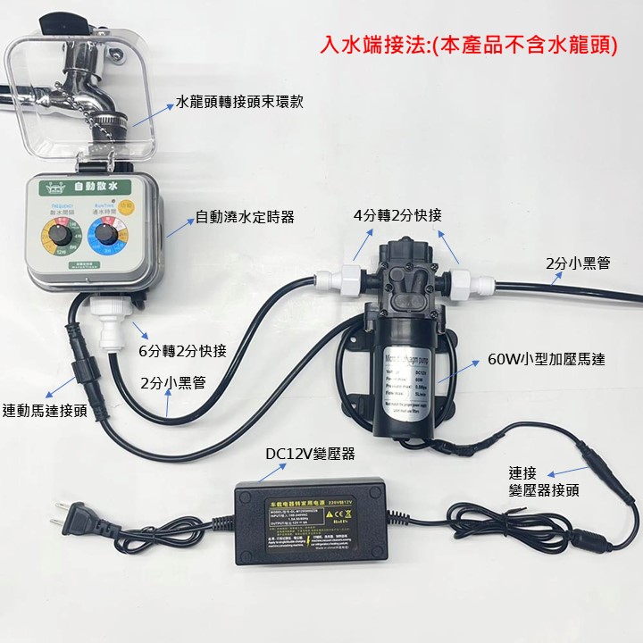 2.定時器內建微動開關,啟動時連動馬達加壓,關閉時同步停止馬達運轉,安裝需注意進水及出水方向。