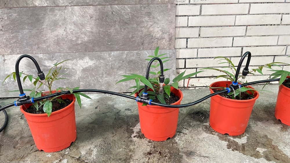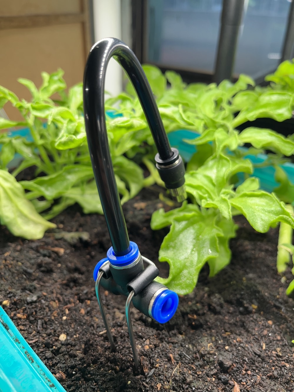 三通快接有圓孔,使用"不銹鋼插地架"將萬向可調噴霧頭,固定土壤表面。插地架可任意彎折。