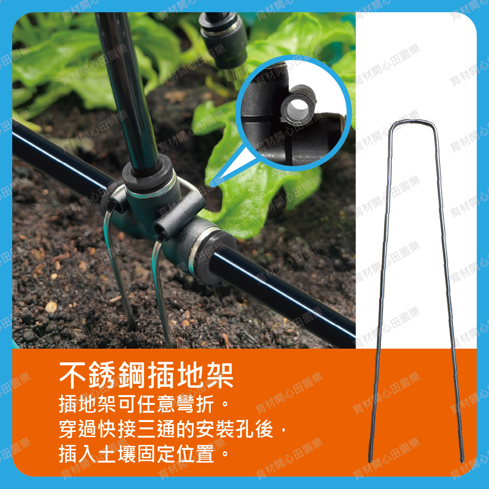 三通快接有圓孔,使用"不銹鋼插地架"將萬向可調噴霧頭,固定土壤表面。插地架可任意彎折。