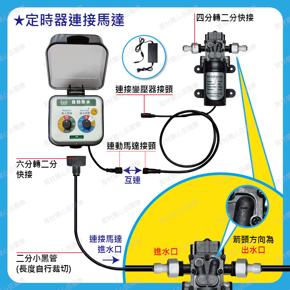 2.定時器內建微動開關,啟動時連動馬達加壓,關閉時同步停止馬達運轉,安裝需注意進水及出水方向。