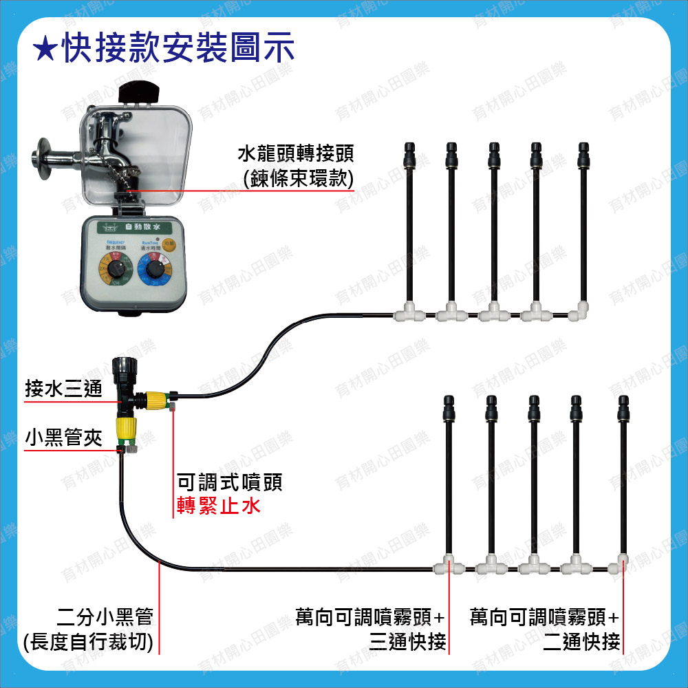已配好快插白色三通、L通,可直接安裝育材自動澆水套組用二分小黑管。