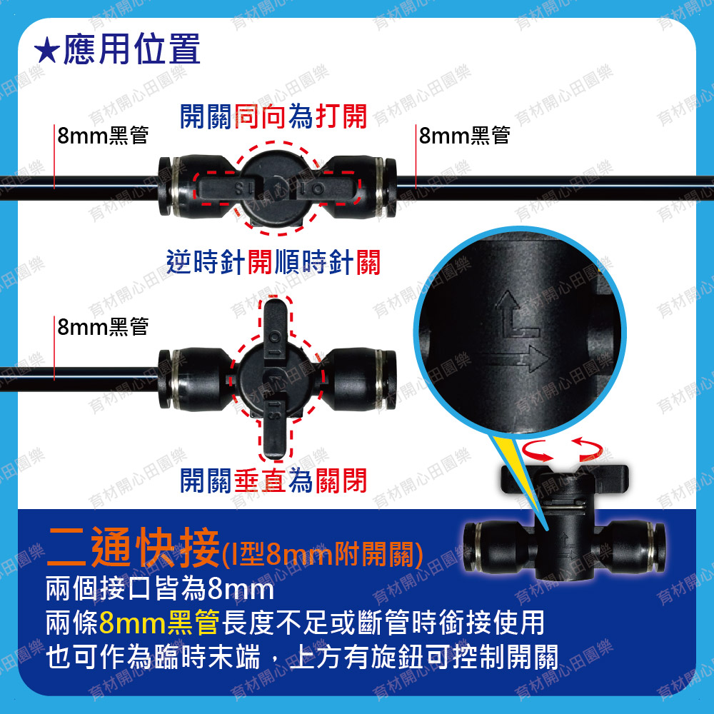 8mm快速接頭-多款適用管徑8mm黑管:如育材陽台庭院...等澆水系統8mm黑管直接剪斷即可安裝、拆裝方便。