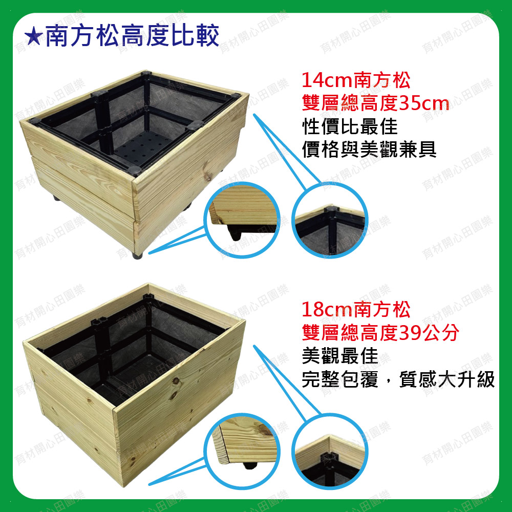 南方松扣片扣入原本的種植箱,南方松木板厚度1.6公分高度14cm南方松1尺80元高度18cm南方松1尺110元組裝後總高皆為21cm1尺=30公分