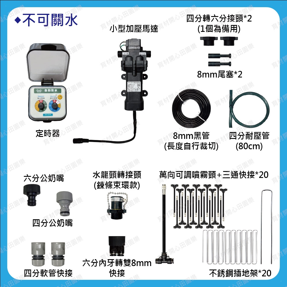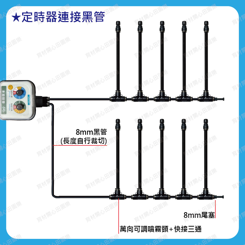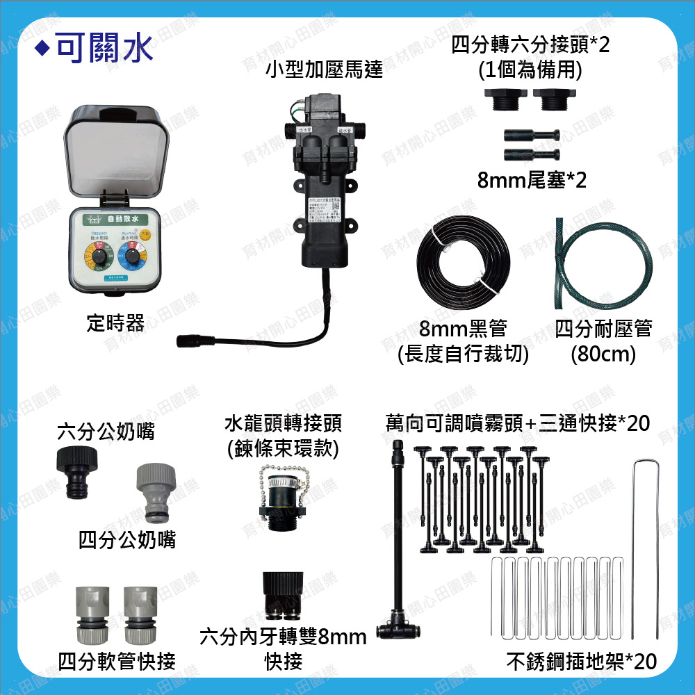 需搭配水桶吸水或電磁閥開關水,使用家用電子定時器設定時間開關。