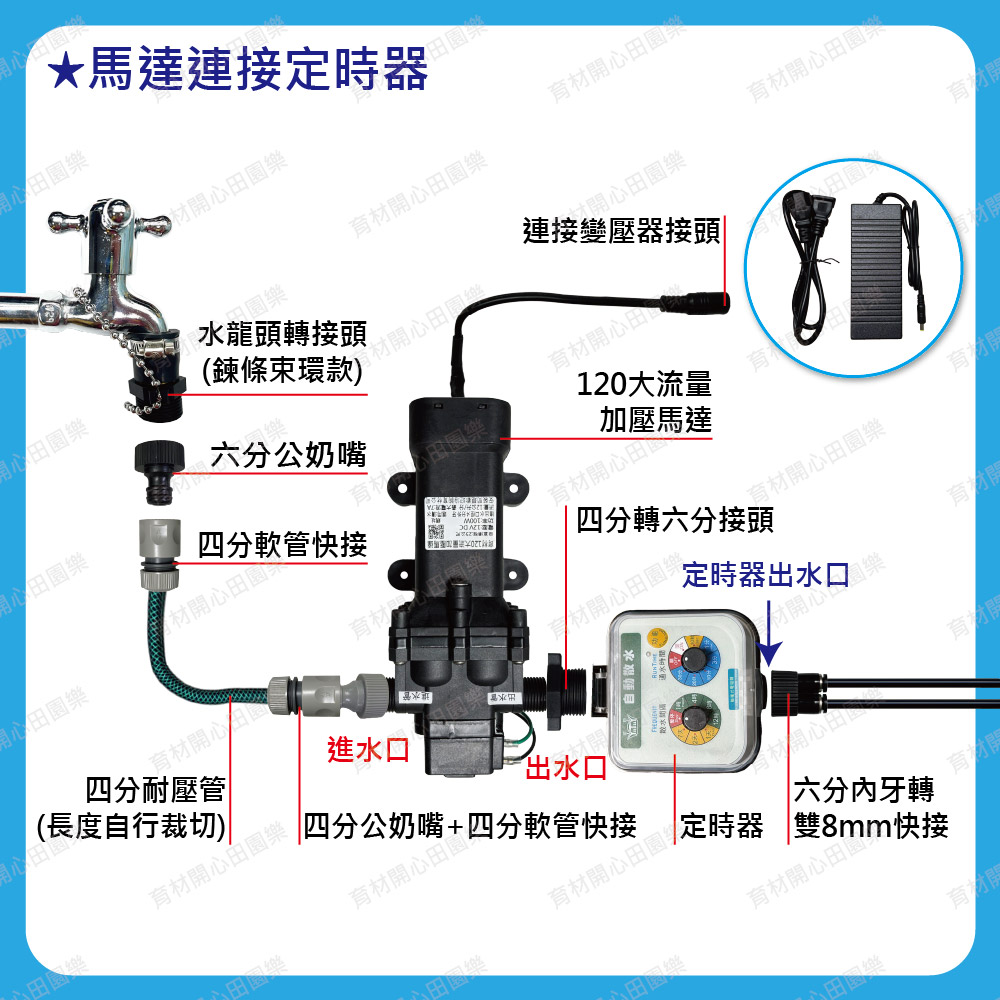 注意防水,定時器及加壓馬達不可淋雨