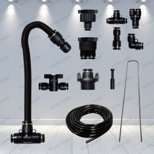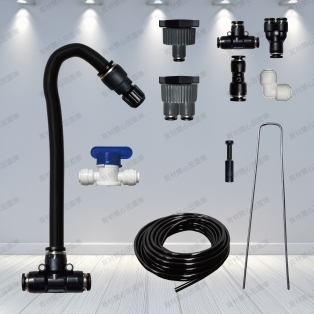 十字噴架左右使用黑色小夾管可鎖緊小黑管,十字架三邊皆可出水,最末端用"可調式噴頭"鎖緊即可止水。