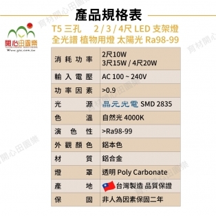 臺灣製造,品質保證模擬陽光增添有效光能量解決日照不足促進植物生長T5 三孔 LED 支架燈 (全光譜 植物用燈 太陽光 Ra98-99)輸入電壓: AC 100 ~ 240V瓦數:2尺-10W3尺-15W4尺-20W色溫: 自然光4000K光源: 晶元光電 SMD 2835演色性: >Ra98-99亮度測式:距離23cm亮度3203 lm保固二年 (非人為因素)配件皆附: 可選30cm或50cm*1串接線、固定夾*2、螺絲*2加購價100元:三孔開關電源線: 三孔1.8米開關電源線