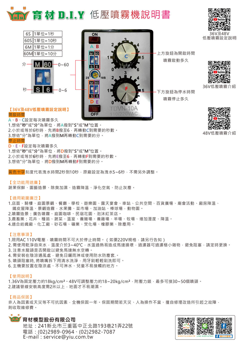 1.限用AC 110V電壓,噴霧時間不可大於停止時間。(如要220V規格,請另行告知)