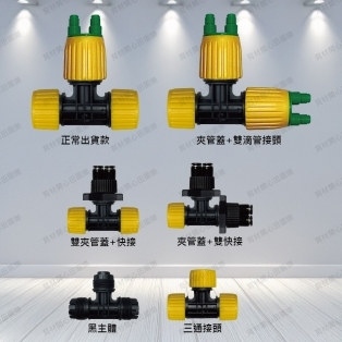 十字噴架左右使用黑色小夾管可鎖緊小黑管,十字噴架三邊皆可出水,最末端用"可調式噴頭"鎖緊即可止水。
