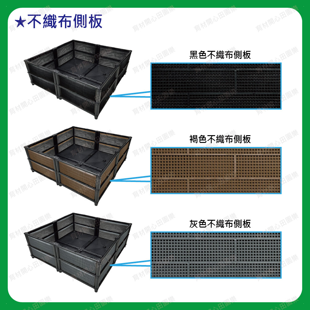 雙層尺寸種植箱,箱子裝土量較深,適合種植深根植物及花卉等。側板分為不織布側板、網孔側板、密側板,依需求可選擇不同種類側板*不織布側板: 防止土壤流失並兼顧排水性*網孔側板: 網孔通風性可加速土壤乾燥*密側板: 外觀不卡汙泥且保水性極佳