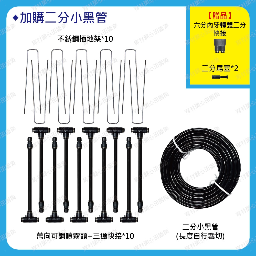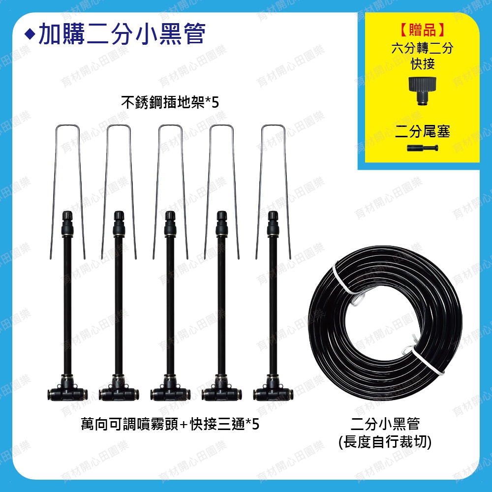 3.二分小黑管可跟陽台庭院套組共用一條小黑管建議串接5~10支噴霧頭,使用快接三通串接安裝方便。管線末端插入二分尾塞即可止水。