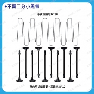 2.萬向霧狀噴頭下方為三通快速接頭,安裝簡單,可用不銹鋼插地架固定在盆栽,或DIY用束帶固定於欄杆。