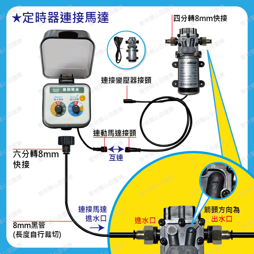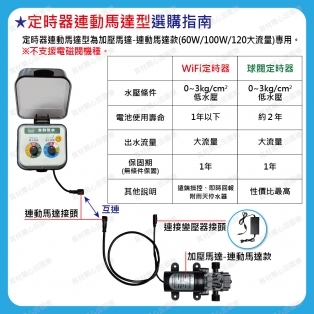 2.定時器內建微動開關,啟動時連動馬達加壓,關閉時同步停止馬達運轉,自動澆水定時器啟動澆水時,連動馬達也會啟動。定時器關閉澆水時,連動馬達一併關閉安裝時需注意進水及出水方向。