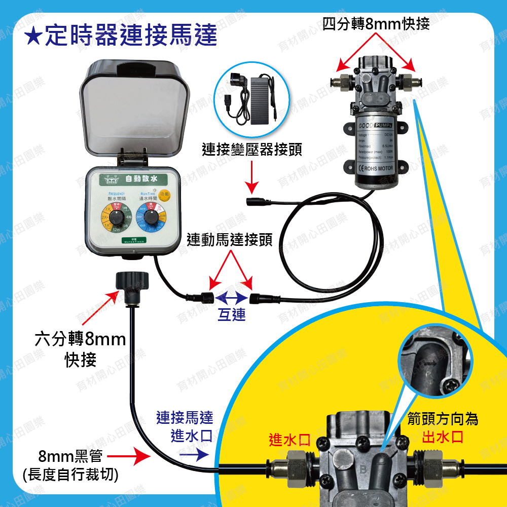 2.定時器內建微動開關,啟動時連動馬達加壓,關閉時同步停止馬達運轉,安裝時需注意進水及出水方向。