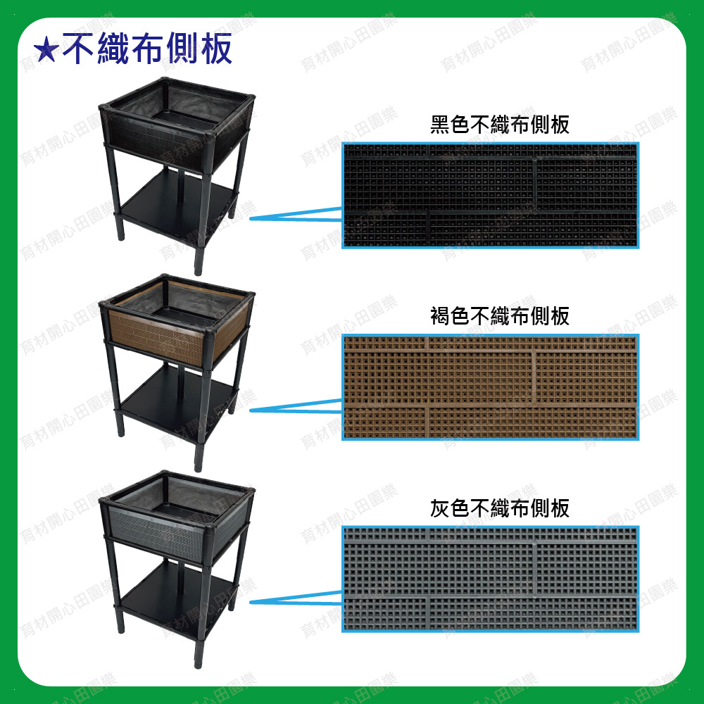 尺寸為45*45公分,正方形底盤設計產品特點:1. 側板分為不織布側板、網孔側板、密側板,依需求可選擇不同種類側板不織布側板: 防止土壤流失並兼顧排水性網孔側板: 網孔通風性可加速土壤乾燥密側板: 外觀不卡汙泥且保水性極佳2.底部中間多一個支撐點可支撐3.可多個拼接組合