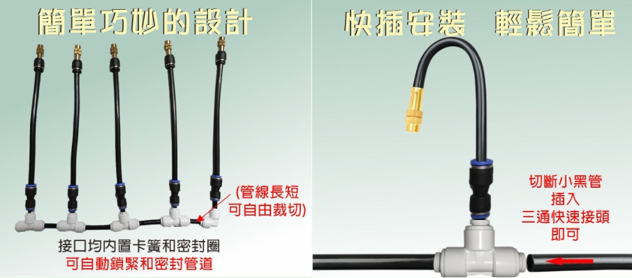白色快速接頭-多款適用管徑1/4”(俗稱2分管)2分小黑管:如育材陽台庭院...等澆水系統2分尼龍管用:如育材低壓噴霧系統2分小黑管直接剪斷即可安裝、拆裝方便。