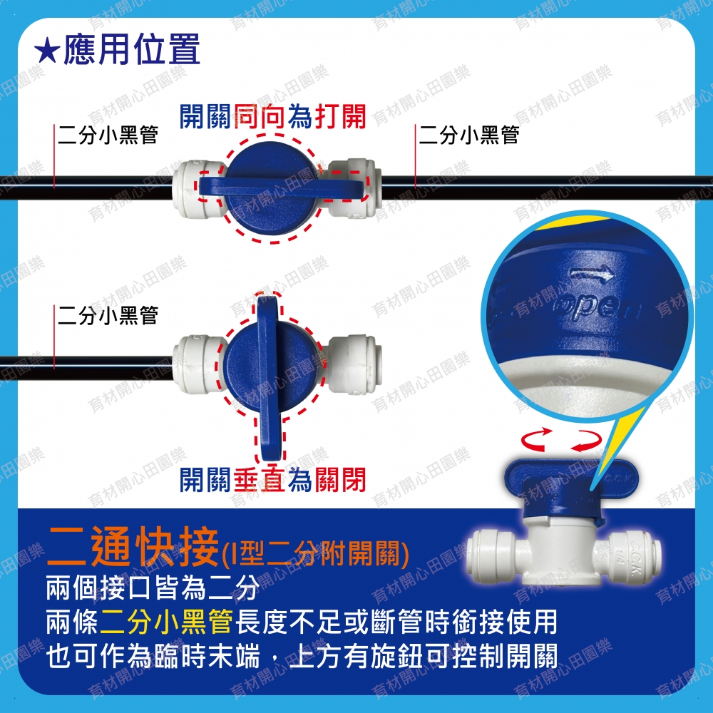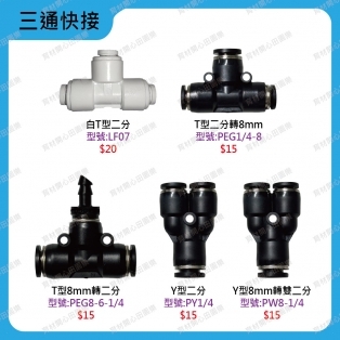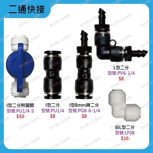 白色/黑色快速接頭-多款適用管徑1/4”(俗稱二分管)與8mm分流/轉換二分小黑管:如育材陽台庭院...等澆水系統二分尼龍管用:如育材低壓噴霧系統二分小黑管直接剪斷即可安裝、拆裝方便。