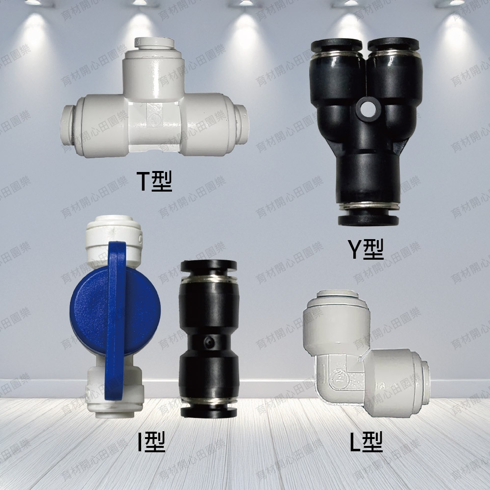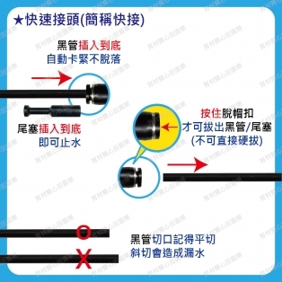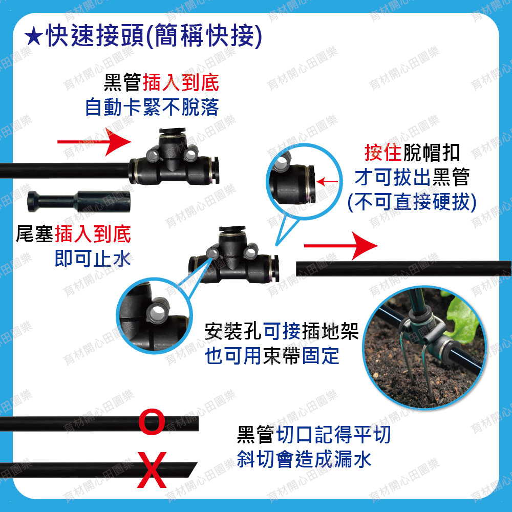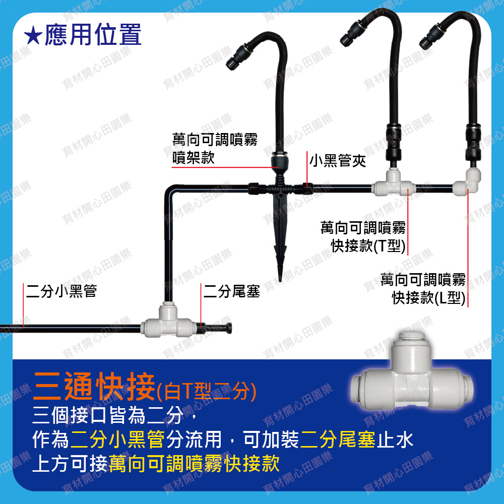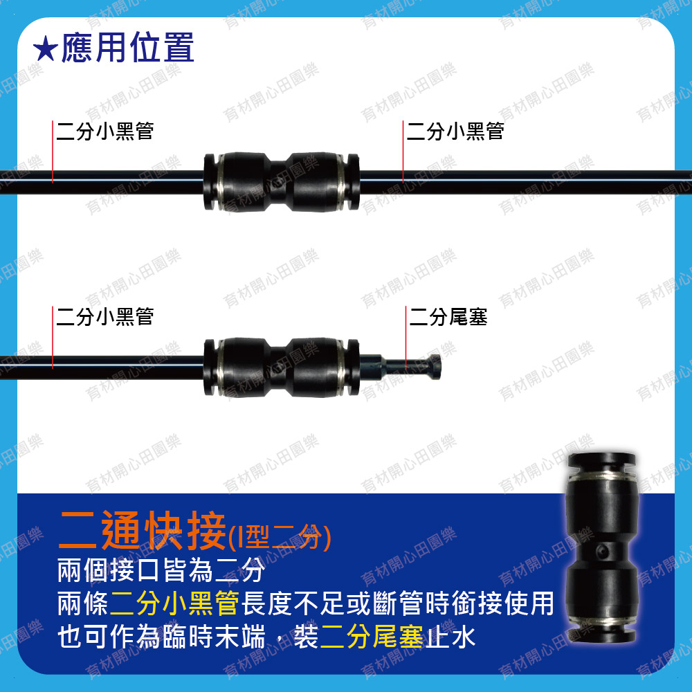 白色/黑色快速接頭-多款適用管徑1/4”(俗稱二分管)與8mm分流/轉換二分小黑管:如育材陽台庭院...等澆水系統二分尼龍管用:如育材低壓噴霧系統二分小黑管直接剪斷即可安裝、拆裝方便。