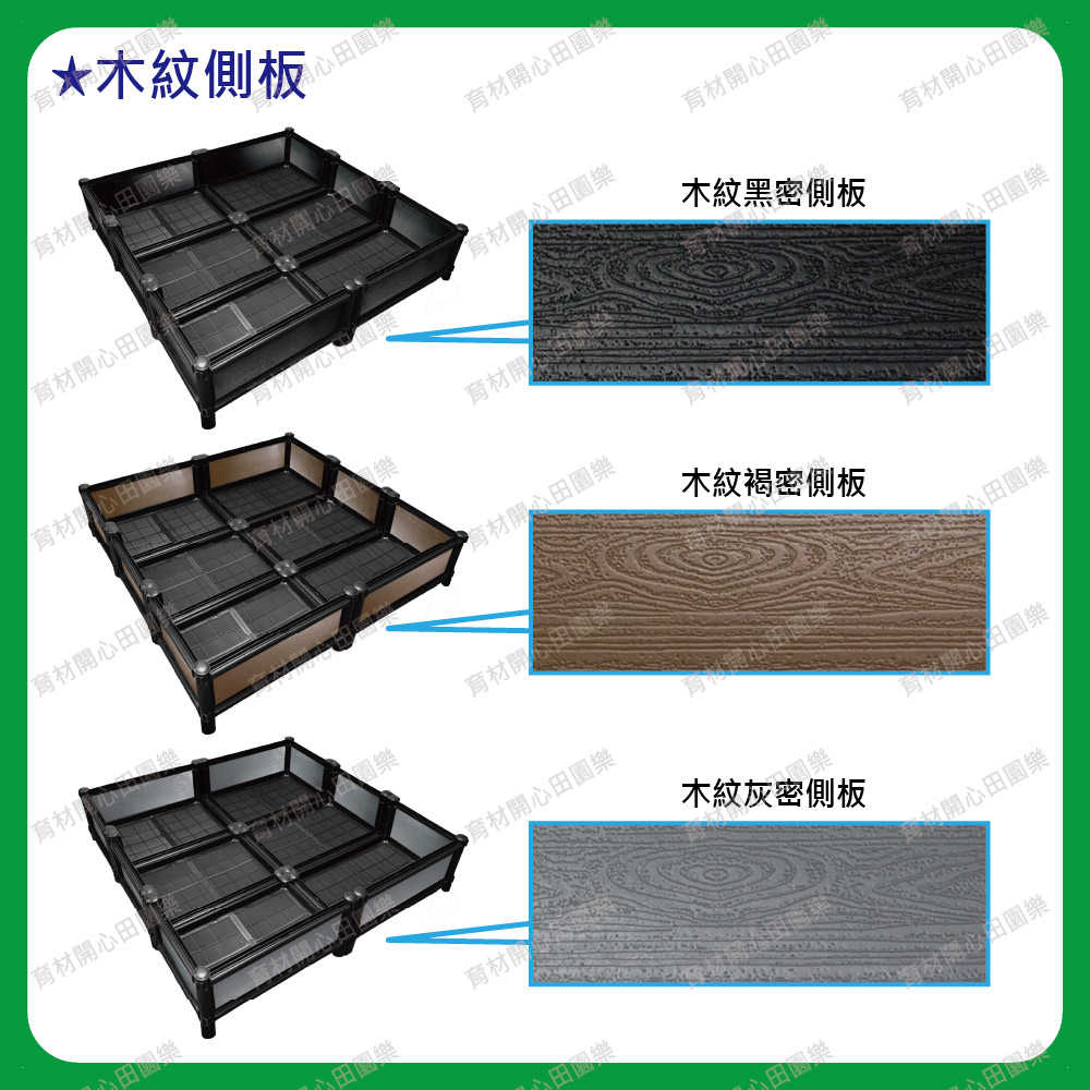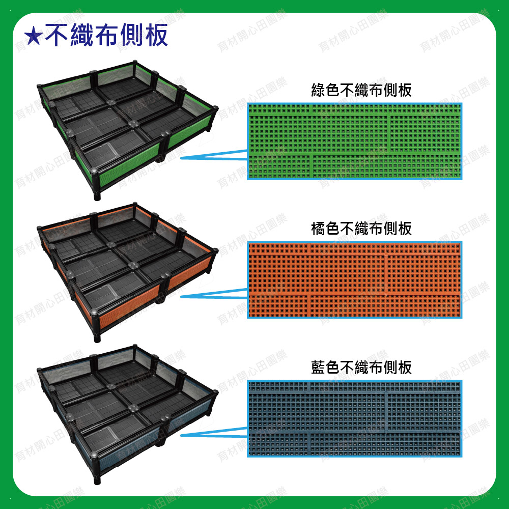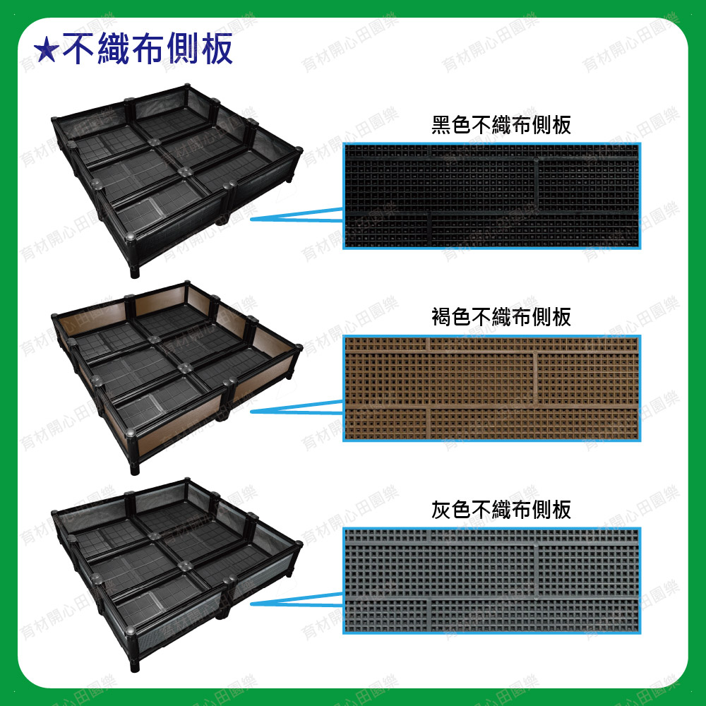 尺寸為90*90公分或135*60cm產品特點:1. 側板分為不織布側板、網孔側板、密側板,依需求可選擇不同種類側板 不織布側板: 防止土壤流失並兼顧排水性 網孔側板: 網孔通風性可加速土壤乾燥 密側板: 外觀不卡汙泥且保水性極佳2. 建議加購底排水板, 可達土水分離